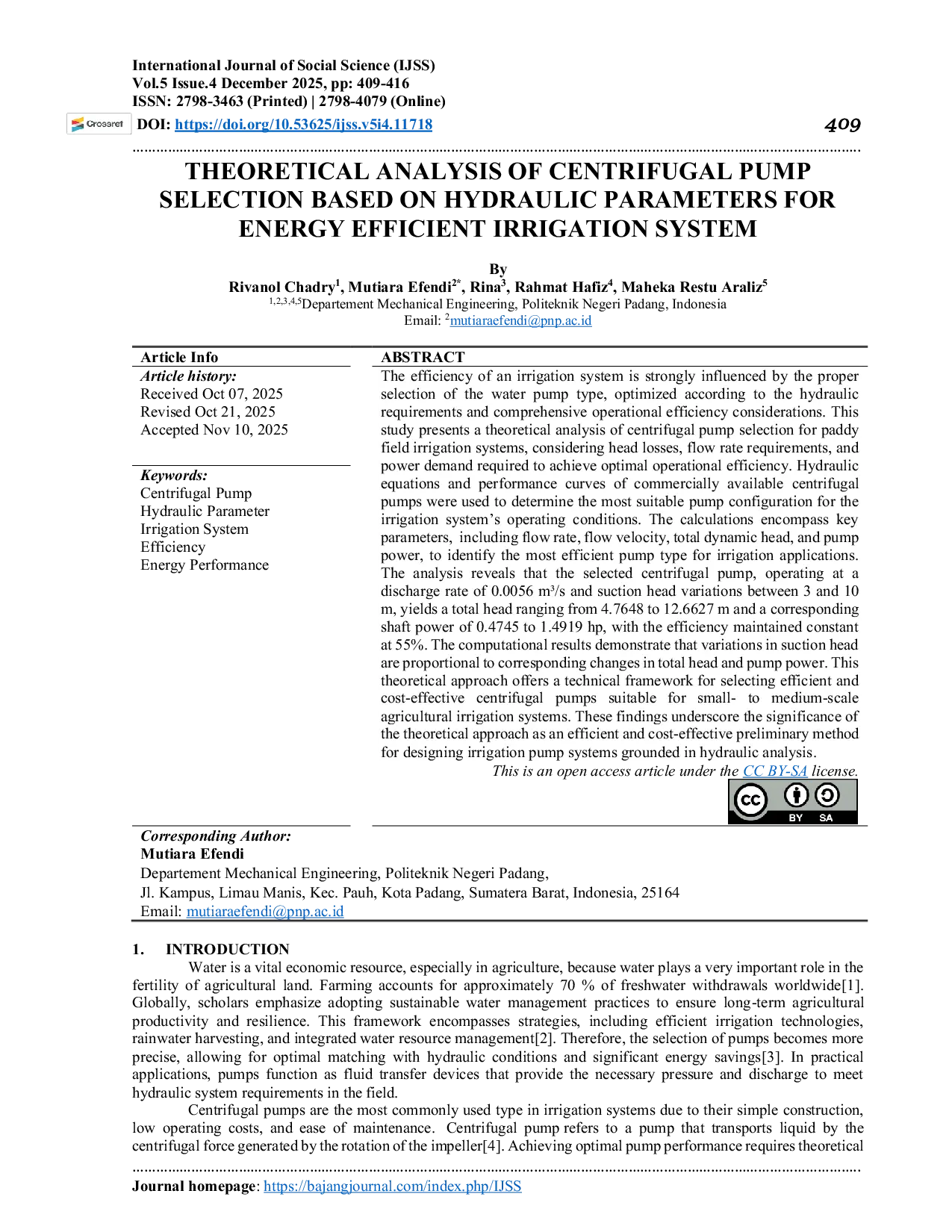 International Journal of Social ScienceInternational Journal of Social ScienceEfisiensi sistem irigasi sangat dipengaruhi oleh pemilihan pompa air yang tepat, yang dioptimalkan sesuai dengan kebutuhan hidrolik dan pertimbangan efisiensi operasional secara menyeluruh. Studi ini menyajikan analisis teoritis pemilihan pompa sentrifugal untuk sistem irigasi sawah, dengan mempertimbangkan kehilangan tekanan, kebutuhan debit aliran, dan daya yang diperlukan untuk mencapai efisiensi operasional optimal. Persamaan hidrolik dan kurva kinerja pompa sentrifugal komersial digunakan untuk menentukan konfigurasi pompa terbaik untuk kondisi operasi sistem irigasi. Perhitungan mencakup parameter penting, termasuk debit aliran, kecepatan aliran, total head dinamis, dan daya pompa, untuk mengidentifikasi jenis pompa paling efisien untuk aplikasi irigasi. Analisis menunjukkan bahwa pompa sentrifugal yang dipilih, beroperasi pada laju pengeluaran 0,0056 m³/s dan variasi head hisap antara 3 hingga 10 m, menghasilkan total head berkisar antara 4,7648 hingga 12,6627 m dan daya poros berkisar antara 0,4745 hingga 1,4919 hp, dengan efisiensi tetap pada 55%. Hasil perhitungan menunjukkan bahwa variasi head hisap sebanding dengan perubahan total head dan daya pompa yang sesuai. Pendekatan teoritis ini menawarkan kerangka teknis untuk memilih pompa sentrifugal yang efisien dan biaya rendah yang cocok untuk sistem irigasi pertanian skala kecil hingga menengah. Temuan ini menekankan pentingnya pendekatan teoritis sebagai metode awal yang efisien dan biaya rendah untuk merancang sistem pompa irigasi berbasis analisis hidrolik.