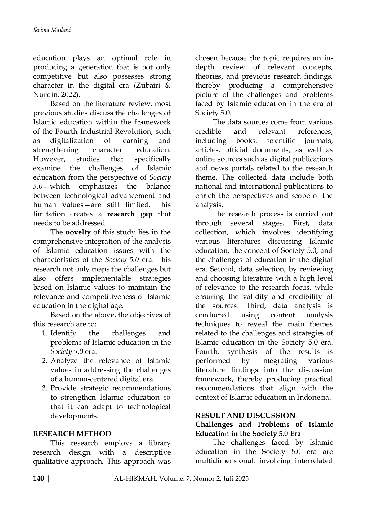 AL-HIKMAH (Jurnal Pendidikan dan Pendidikan Agama Islam)AL-HIKMAH (Jurnal Pendidikan dan Pendidikan Agama Islam)Era Society 5.0 merupakan konsep masyarakat yang berpusat pada manusia (human-centered) dengan pemanfaatan teknologi cerdas untuk meningkatkan kualitas hidup. Perubahan ini membawa tantangan sekaligus peluang bagi pendidikan Islam. Penelitian ini bertujuan mengidentifikasi permasalahan dan tantangan yang dihadapi pendidikan Islam dalam menghadapi era Society 5.0 serta menawarkan strategi adaptif yang relevan. Metode yang digunakan adalah studi pustaka dengan mengkaji berbagai sumber seperti buku, jurnal, artikel ilmiah, dan media daring yang relevan. Hasil penelitian menunjukkan bahwa pendidikan Islam menghadapi tantangan pada aspek kurikulum, kompetensi pendidik, pemanfaatan teknologi, dan relevansi nilai-nilai keislaman dengan tuntutan era digital. Kebaruan penelitian ini terletak pada integrasi analisis tantangan pendidikan Islam dengan kerangka konsep Society 5.0 secara komprehensif. Kesimpulan penelitian merekomendasikan penguatan literasi digital islami, pembaruan kurikulum, dan pengembangan kompetensi guru untuk memastikan pendidikan Islam tetap relevan di era disrupsi teknologi.