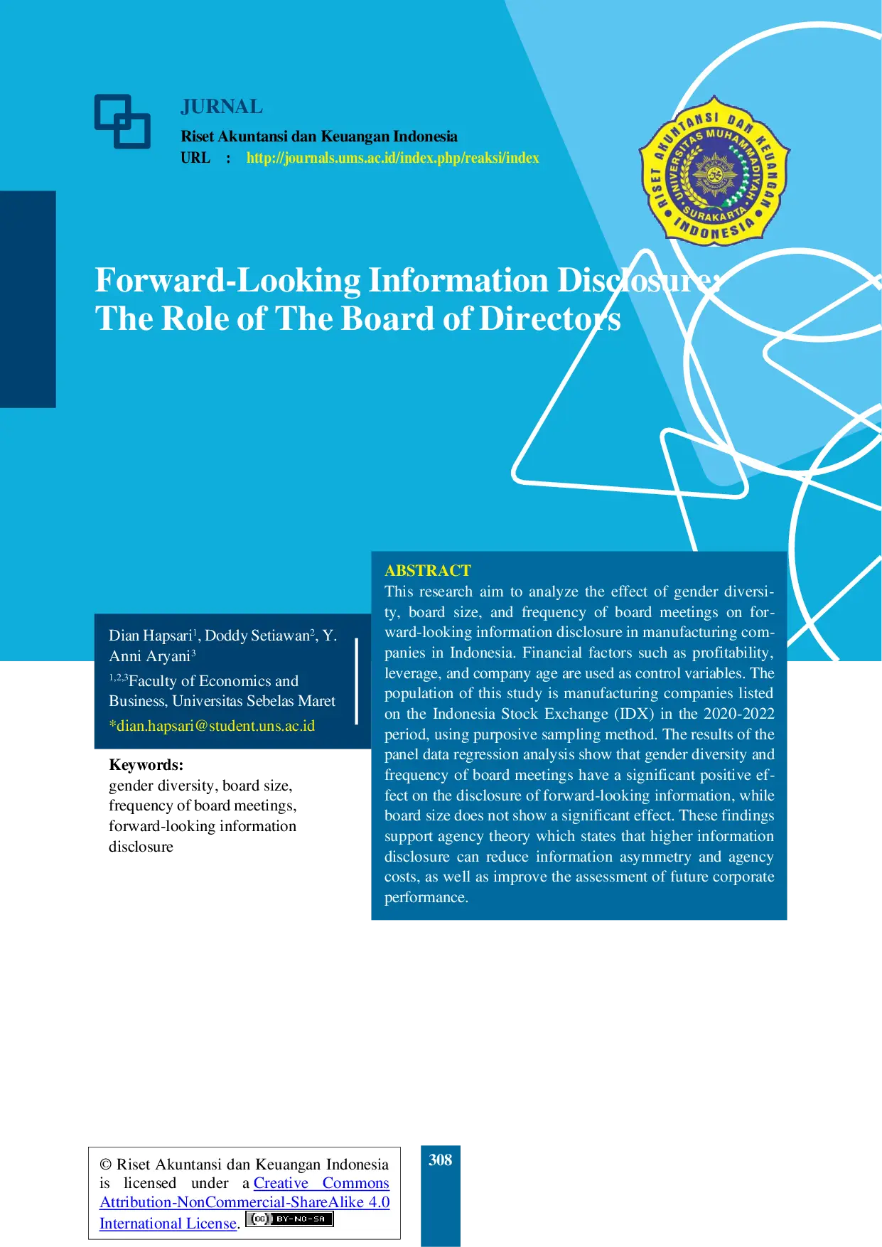 Riset Akuntansi dan Keuangan IndonesiaRiset Akuntansi dan Keuangan IndonesiaThis research aims to analyze the effect of gender diversity, board size, and frequency of board meetings on forward-looking information disclosure in manufacturing companies in Indonesia. Financial factors such as profitability, leverage, and company age are used as control variables. The population of this study is manufacturing companies listed on the Indonesia Stock Exchange (IDX) in the 2020-2022 period, using purposive sampling method. The results of the panel data regression analysis show that gender diversity and frequency of board meetings have a significant positive effect on the disclosure of forward-looking information, while board size does not show a significant effect. These findings support agency theory which states that higher information disclosure can reduce information asymmetry and agency costs, as well as improve the assessment of future corporate performance.