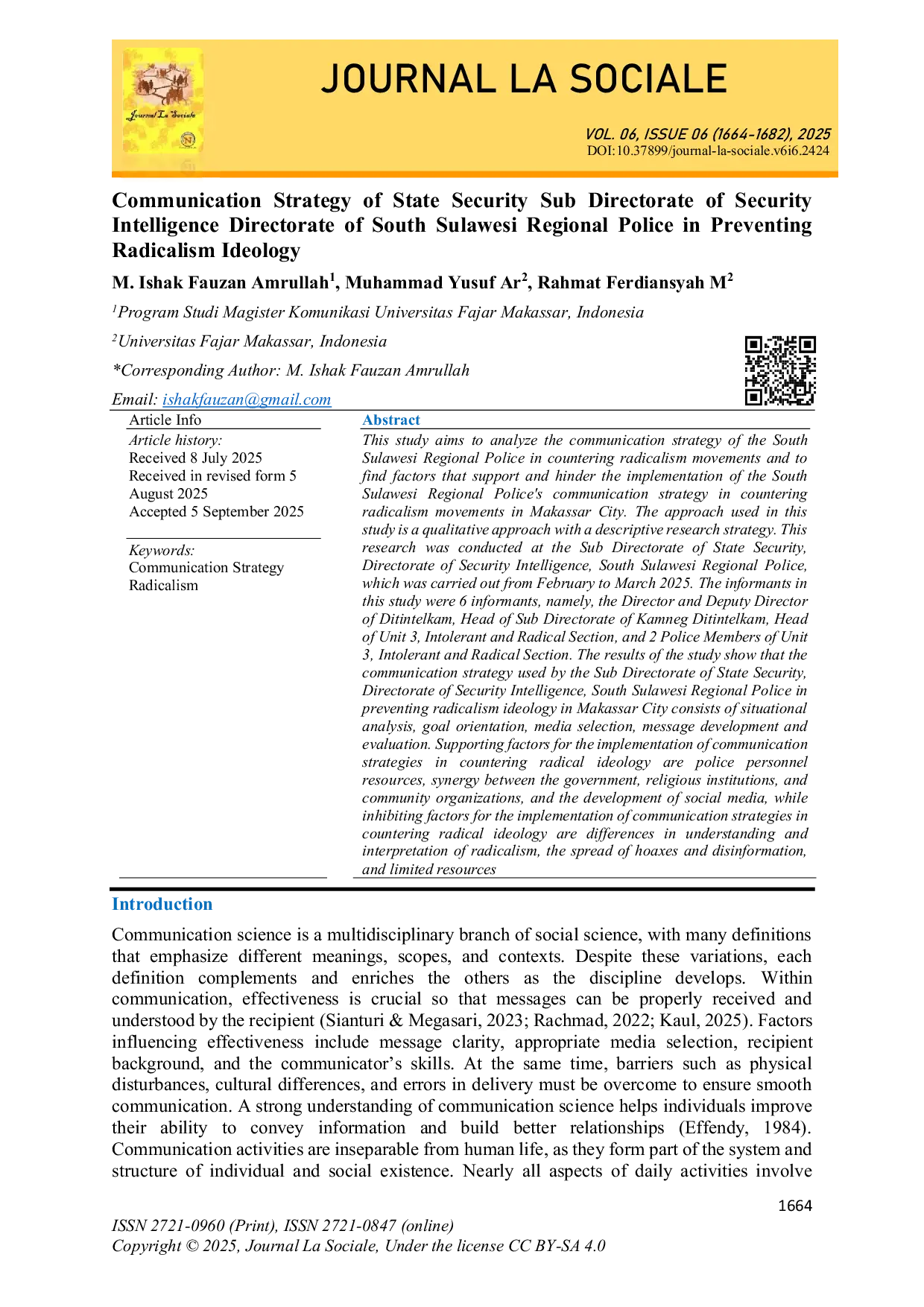 Journal La SocialeJournal La SocialePenelitian ini bertujuan untuk menganalisis strategi komunikasi yang diterapkan oleh Kepolisian Daerah Sulawesi Selatan dalam menangkal gerakan radikalisme dan untuk menemukan faktor-faktor yang mendukung dan menghambat implementasi strategi komunikasi Kepolisian Daerah Sulawesi Selatan dalam menangkal gerakan radikalisme di Kota Makassar. Pendekatan yang digunakan dalam penelitian ini adalah pendekatan kualitatif dengan strategi penelitian deskriptif. Penelitian ini dilakukan di Subdit Kamneg Ditintelkam Polda Sulawesi Selatan, yang dilaksanakan dari Februari hingga Maret 2025. Informan dalam penelitian ini adalah 6 informan, yaitu Direktur dan Wakil Direktur Ditintelkam, Kepala Subdit Kamneg Ditintelkam, Kepala Unit 3, Bagian Intoleransi dan Radikal, serta 2 Anggota Polisi dari Unit 3, Bagian Intoleransi dan Radikal. Hasil penelitian menunjukkan bahwa strategi komunikasi yang digunakan oleh Subdit Kamneg Ditintelkam Polda Sulawesi Selatan dalam mencegah ideologi radikalisme di Kota Makassar terdiri dari analisis situasi, orientasi tujuan, pemilihan media, pengembangan pesan, dan evaluasi. Faktor-faktor pendukung untuk implementasi strategi komunikasi ideologi radikalisme adalah sumber daya personel polisi, sinergi antara pemerintah, lembaga keagamaan, dan organisasi masyarakat, serta perkembangan media sosial, sedangkan faktor-faktor penghambat untuk implementasi strategi komunikasi dalam menangkal ideologi radikalisme adalah perbedaan pemahaman dan interpretasi tentang radikalisme, penyebaran hoax dan disinformasi, serta sumber daya terbatas dalam menangkal radikalisme.