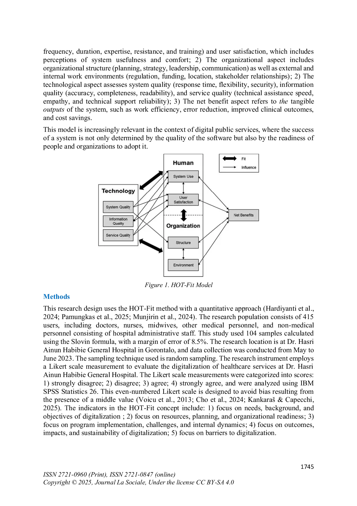 Journal La SocialeJournal La SocialeTransformasi digital di sektor kesehatan telah menjadi elemen penting dalam meningkatkan kualitas, efisiensi, dan transparansi pelayanan publik. Studi ini bertujuan untuk mengevaluasi keberhasilan digitalisasi pelayanan kesehatan di RSUD dr. Hasri Ainun Habibie Gorontalo menggunakan kerangka HOT-Fit (Human, Organization, Technology, dan Net Benefit). Penelitian ini menggunakan pendekatan kuantitatif dengan instrumen survei yang diberikan kepada 104 responden, terdiri dari staf medis dan non-medis. Hasil penelitian menunjukkan bahwa semua indikator HOT-Fit berada dalam kategori sangat tinggi, terutama kualitas informasi (3,47) dan kepuasan pengguna (3,38), yang keduanya menunjukkan korelasi kuat dengan manfaat bersih dari digitalisasi. Tantangan utama yang teridentifikasi adalah konektivitas internet yang tidak stabil dan fragmentasi aplikasi, meskipun sebagian besar pengguna menilai sistem berfungsi secara efektif. Rekomendasi yang dihasilkan dari studi ini meliputi peningkatan infrastruktur jaringan, pengembangan platform digital terintegrasi (super app), dan penyediaan pelatihan teknis lanjutan untuk sumber daya manusia. Hasil ini memperkuat pentingnya mengintegrasikan aspek manusia, organisasi, dan teknologi untuk memastikan keberhasilan transformasi digital di layanan kesehatan daerah.
