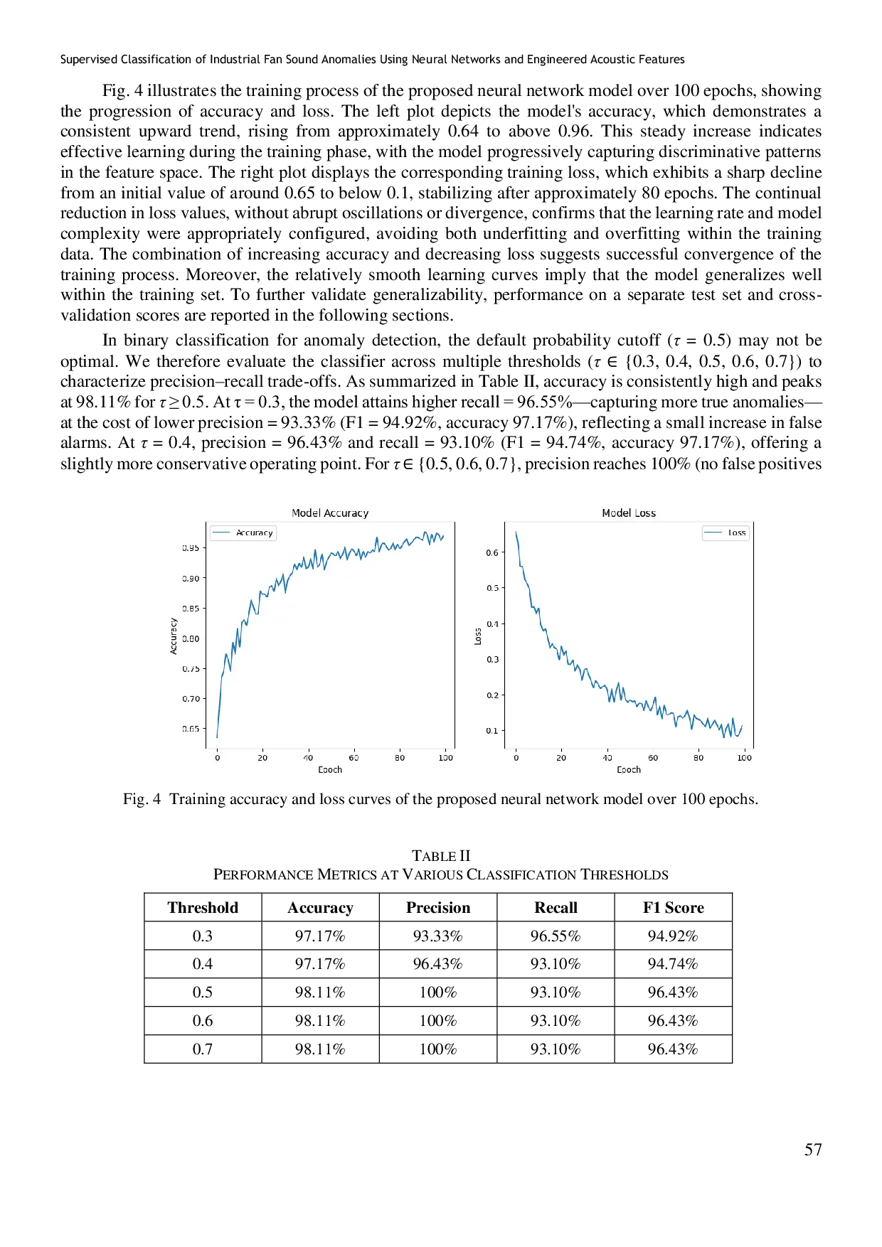 Penelitian ini berhasil mengembangkan klasifikasi berbasis jaringan saraf terawasi untuk mendeteksi anomali suara pada sistem kipas industri dengan memanfaatkan fitur akustik yang direkayasa.Hasil pengujian menunjukkan bahwa model yang diusulkan mampu mencapai akurasi tinggi, dengan presisi 100% dan recall 93.Temuan ini mengindikasikan potensi besar dari kombinasi fitur akustik yang dapat diinterpretasikan dengan klasifikasi saraf yang ringkas untuk deteksi anomali non-invasif dalam aplikasi Industri 4.