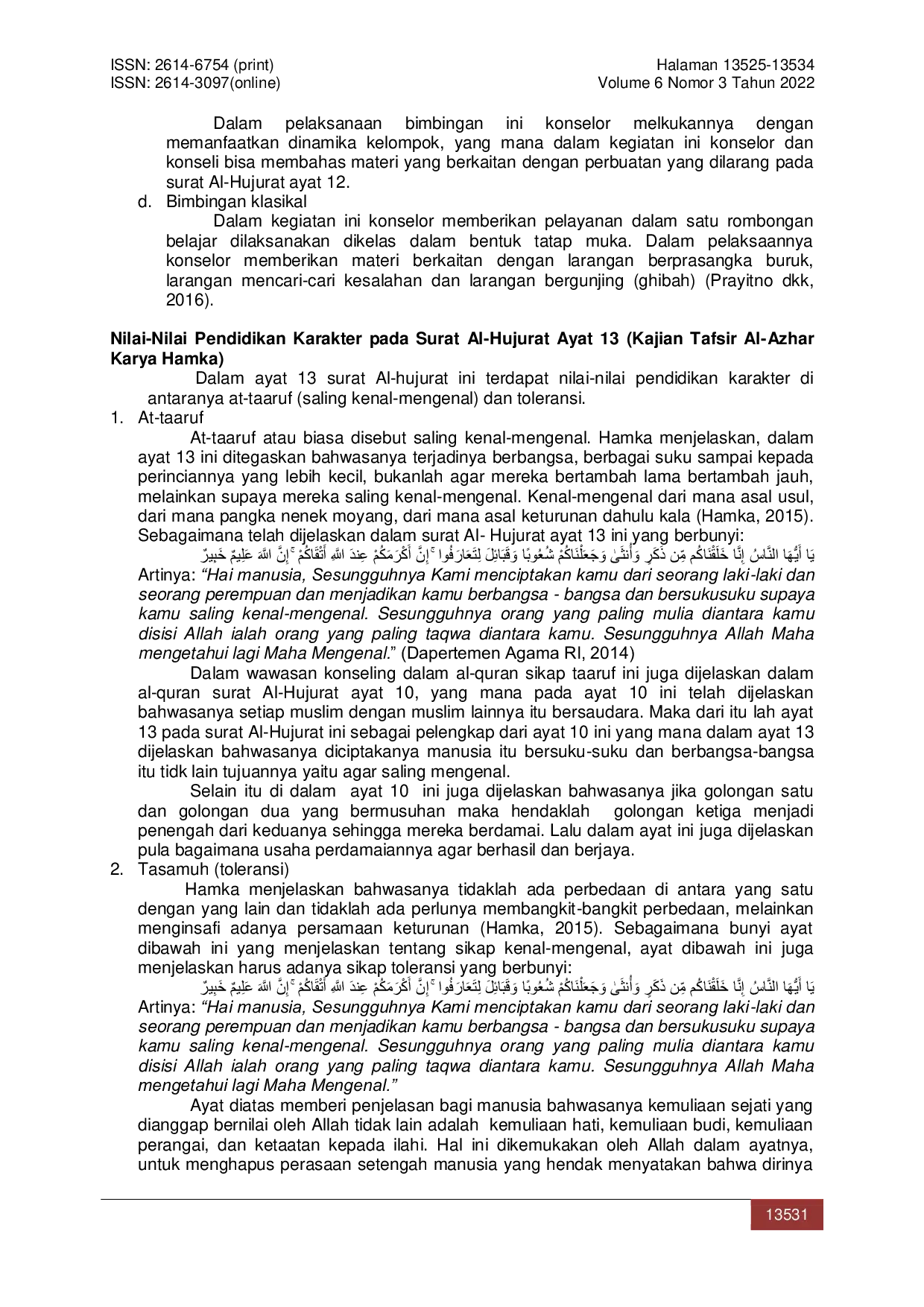 Jurnal Pendidikan TambusaiJurnal Pendidikan TambusaiPenelitian ini dilatarbelakangi oleh fakta yang terjadi yaitu masih banyak ditemukan antar tetangga mempergunjingkan tetangganya bahkan anggota keluarganya sendiri. Bahkan masih ada orang yang membeda-bedakan dan kurangnya toleransi antar sesama di lingkungan tempat tinggal. Perilaku tersebut dapat merugikan diri sendiri maupun orang lain bahkan dapat memutuskan tali silaturrahim di antara dua orang sehingga penulis ingin mengkaji tentang nilai-nilai pendidikan karakter yang terdapat dalam Al-Quran surat Al-Hujurat ayat 11-13 berdasarkan kajian tafsir Al-Azhar karya Hamka. Jenis penelitian ini menggunakan penelitian library research yaitu suatu studi yang digunakan dalam mengumpulkan informasi dan data dengan bantuan berbagai macam material yang ada di perpustakaan. Teknik pengumpulan data dalam penelitian ini adalah dokumentasi yang merupakan teknik pengumpulan data yang didapat dari sumber primer yaitu tafsir Al-Azhar karya Hamka dan sekunder yang merupakan sumber data tambahan yang menunjang data pokok. Sedangkan teknis analisis data pada penelitian ini yaitu menggunakan analisis isi. Berdasarkan hasil penelitian ini menunjukkan bahwa nilai-nilai pendidikan karakter yang terdapat dalam Al-quran surat Al-Hujurat ayat 11-13 dalam kajian tafsir Al-Azhar karya Hamka yaitu pada ayat 11 terdapat beberapa nilai pendidikan karakter yaitu larangan memperolok-olok, mengejek, menghina, bahkan merendahkan diri orang lain, dan selain itu terdapat perintah untuk bertobat. Pada ayat 12 terdapat nilai pendidikan karakter yaitu larangan berprasangka, mencari-cari kesalahan dan mempergunjingkan (ghibah). Kemudian, pada ayat 13 terdapat nilai pendidikan karakter yaitu at-taaruf (saling kenal-mengenal), ukhuwah, dan sikap toleransi.