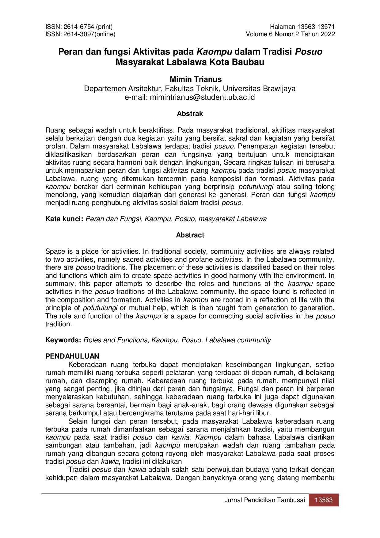 Jurnal Pendidikan TambusaiJurnal Pendidikan TambusaiRuang sebagai wadah untuk beraktifitas. Pada masyarakat tradisional, aktifitas masyarakat selalu berkaitan dengan dua kegiatan yaitu yang bersifat sakral dan kegiatan yang bersifat profan. Dalam masyarakat Labalawa terdapat tradisi posuo. Penempatan kegiatan tersebut diklasifikasikan berdasarkan peran dan fungsinya yang bertujuan untuk menciptakan aktivitas ruang secara harmoni baik dengan lingkungan. Secara ringkas tulisan ini berusaha untuk memaparkan peran dan fungsi aktivitas ruang kaompu pada tradisi posuo masyarakat Labalawa. Ruang yang ditemukan tercermin pada komposisi dan formasi. Aktivitas pada kaompu berakar dari cerminan kehidupan yang berprinsip potutulungi atau saling tolong menolong, yang kemudian diajarkan dari generasi ke generasi. Peran dan fungsi kaompu menjadi ruang penghubung aktivitas sosial dalam tradisi posuo.