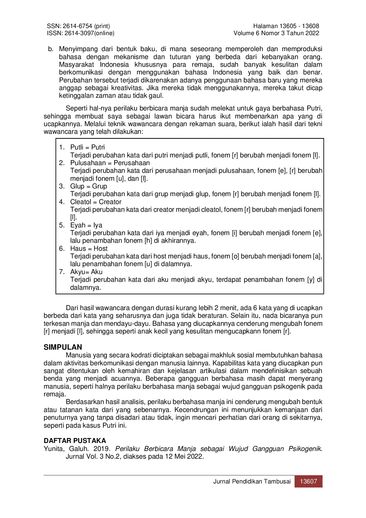 Jurnal Pendidikan TambusaiJurnal Pendidikan TambusaiPerilaku berbicara manja merupakan salah satu wujud dari gangguan psikogenik. Gangguan Psikogenik adalah satu penyakit fungsional yang tidak diketahui basis organiknya, karena itu kondisi seperti ini bukan berasal dari organ tetapi penyebab dari kondisi ini ialah mental seseorang. Penelitian ini menggunakan metode penelitian kualitatif deskripstif. Teknik pengumpulan data dalam penelitian ini adalah melalui teknik observasi dan wawancara, lalu mengamati tuturan dan menyimak penggunaan bahasa untuk memperoleh data melalui rekaman suara. Hasil penelitian membahas tentang perilaku berbicara menjadi sebagai wujud gangguan psikogenik pada seorang remaja wanita. Kesimpulan dari penelitian ini ialah perilaku berbahasa manja cenderung mengubah bentuk atau tatanan kata dari yang sebenarnya.