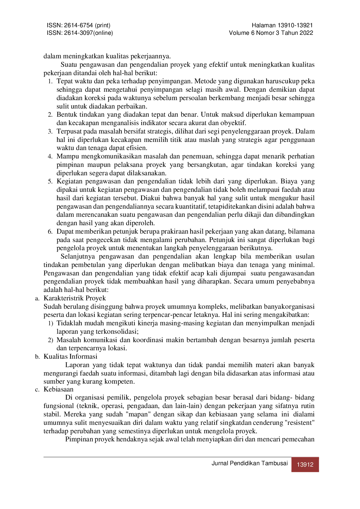 Jurnal Pendidikan TambusaiJurnal Pendidikan TambusaiFokus utama penelitian ini adalah . Penelitian ini menggunakan metode kuantitatif dan teknik pengumpulan data berupa metode kuesioner dan dokumentasi. Metode analisis data yang digunakan adalah analisis regresi berganda dan uji t untuk mengetahui pengaruh parsial variabel X1 dan X2 terhadap variabel Y, serta uji F untuk mengetahui pengaruh simultan variabel X1 dan X2 terhadap variabel Y. Hasil analisis menunjukkan bahwa variabel Pengawasan Proyek berpengaruh positif dan signifikan terhadap peningkatan kualitas pekerjaan Dinas Bina Marga Kabupaten Sukabumi sebesar 76,4%, dan variabel Perekrutan Pegawai juga berpengaruh positif dan signifikan terhadap peningkatan kualitas pekerjaan Dinas Bina Marga Kabupaten Sukabumi sebesar 60,9%. Secara simultan, terdapat pengaruh positif dan signifikan dari variabel Pengawasan Proyek dan Perekrutan Pegawai terhadap peningkatan kualitas pekerjaan Dinas Bina Marga Kabupaten Sukabumi. Hubungan antara Pengawasan Proyek dan Perekrutan Pegawai dengan Kualitas Pekerjaan Dinas Bina Marga Kabupaten Sukabumi memiliki nilai korelasi pearson yang sangat kuat, yaitu 0,848.