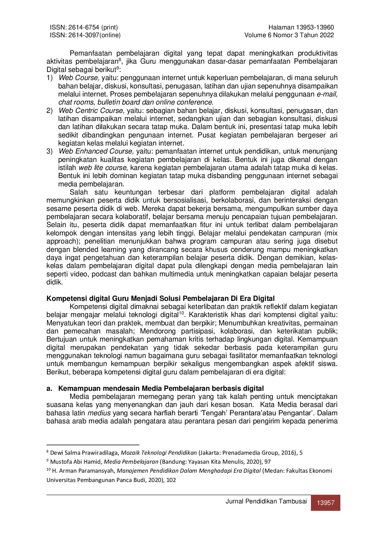 Dalam keberhasilan kegiatan pembelajaran di era digital, guru harus memiliki kompetensi digital sebagai salah satu solusi dalam menghadapi tantangan pembelajaran di era digital.Kompetensi digital menjadi kunci bagi guru untuk dapat mengimbangi perkembangan teknologi dan kebutuhan siswa di era digital.Dengan memiliki kompetensi digital, guru dapat menciptakan pembelajaran yang lebih efektif, efisien, dan relevan dengan perkembangan zaman.