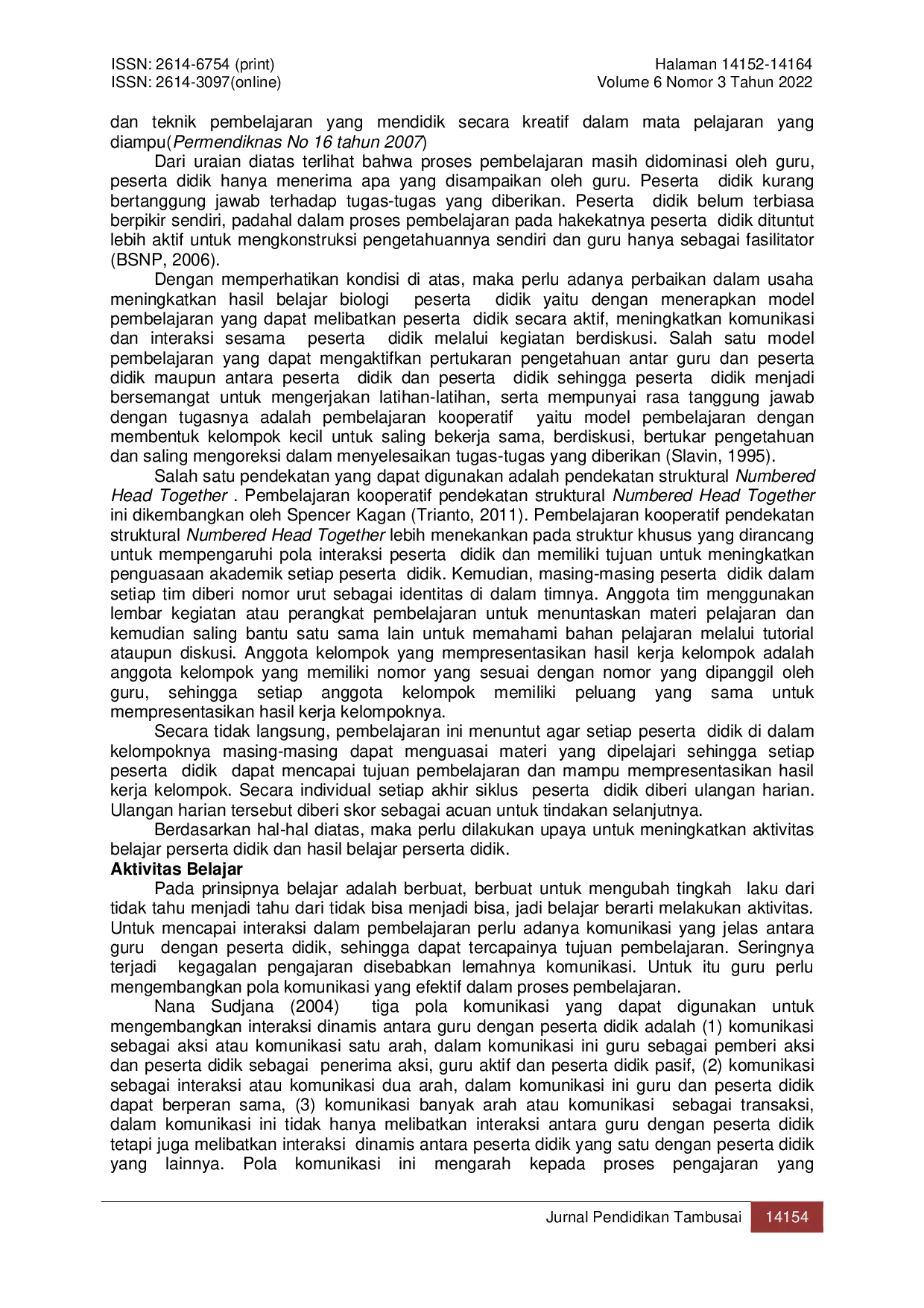 Jurnal Pendidikan TambusaiJurnal Pendidikan TambusaiAktivitas dan hasil belajar siswa kelas XII MIPA 2 Madrasah Aliyah Negeri 1 Pekanbaru belum memuaskan khususnya pada mata pelajaran biologi. Hal ini menyebabkan siswa tidak bertanya kepada teman atau gurunya dan bersikap pasif. Sebagian besar siswa tidak dapat menyelesaikan tugas yang diberikan oleh guru. Salah satu alternatif yang dapat mengatasi permasalahan di atas adalah model pembelajaran Numbered Heads Together. Tujuan penelitian ini adalah untuk meningkatkan aktivitas dan hasil belajar siswa melalui penerapan model pembelajaran The Numbered Heads Together. Penelitian ini merupakan penelitian tindakan kelas, penelitian reflektif dengan tindakan yang dilakukan oleh guru untuk memperbaiki proses pembelajaran dalam dua siklus. Penelitian dimulai pada bulan Agustus dan berakhir pada tahun 2019. Subjek dalam penelitian ini adalah 32 siswa kelas XII MIPA 2 MAN 1 Pekanbaru. Instrumen penelitian berupa angket, kuis, tes hasil belajar yang diberikan setiap akhir pertemuan, lembar observasi pelaksanaan pembelajaran dan catatan lapangan. Data yang terkumpul dianalisis secara deskriptif. Hasil penelitian menunjukkan bahwa aktivitas dan hasil belajar siswa meningkat, dari pertemuan pertama siklus I persentase ketuntasan siswa sebesar 65% dan meningkat menjadi 80% pada pertemuan kedua siklus II. Aktivitas siswa dalam belajar terlihat pada kemauan bertanya dan menjawab pertanyaan kepada teman dan guru meningkat dari kategori rendah menjadi tinggi. Dapat disimpulkan bahwa dengan menggunakan model pembelajaran Numberd Heads Together dapat meningkatkan aktivitas dan hasil belajar siswa.