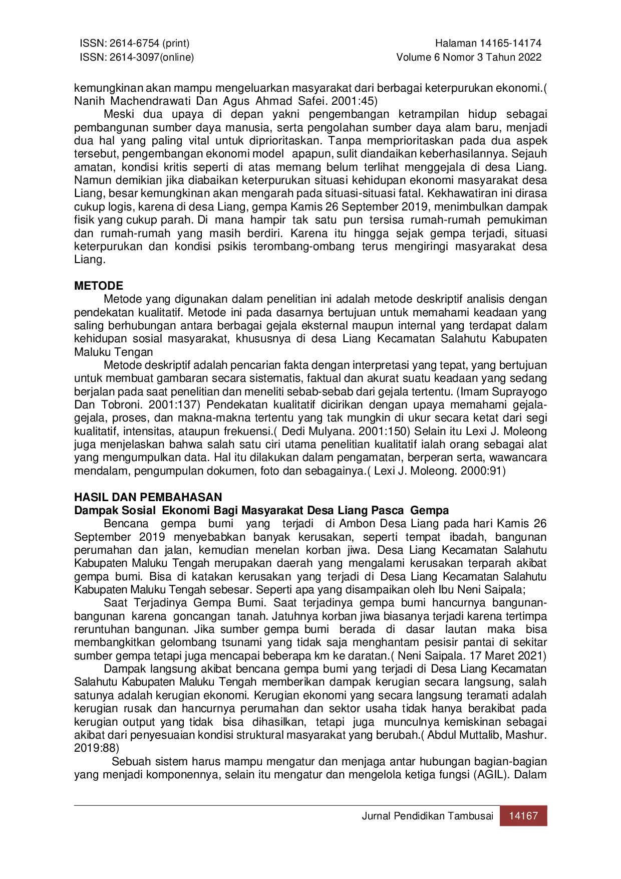 Jurnal Pendidikan TambusaiJurnal Pendidikan TambusaiDampak gempa bumi dengan kekuatan 6.8 skala richter (SR) telah menghancurkan perekonomian dan kehidupan sosial masyarakat Desa Liang, menyebabkan pengangguran, kemiskinan, dan keterbelakangan. Penelitian ini bertujuan untuk mengetahui dampak gempa bumi terhadap kehidupan masyarakat Desa Liang dan strategi masyarakat untuk bangkit dari keterpurukan. Hasil penelitian menunjukkan bahwa gempa bumi menyebabkan kerusakan fisik dan dampak psikis yang signifikan, terutama kelumpuhan ekonomi yang mengakibatkan warga kehilangan mata pencaharian. Masyarakat Desa Liang melakukan upaya psikologis, keagamaan, dan ekonomi untuk bangkit dari keterpurukan.
