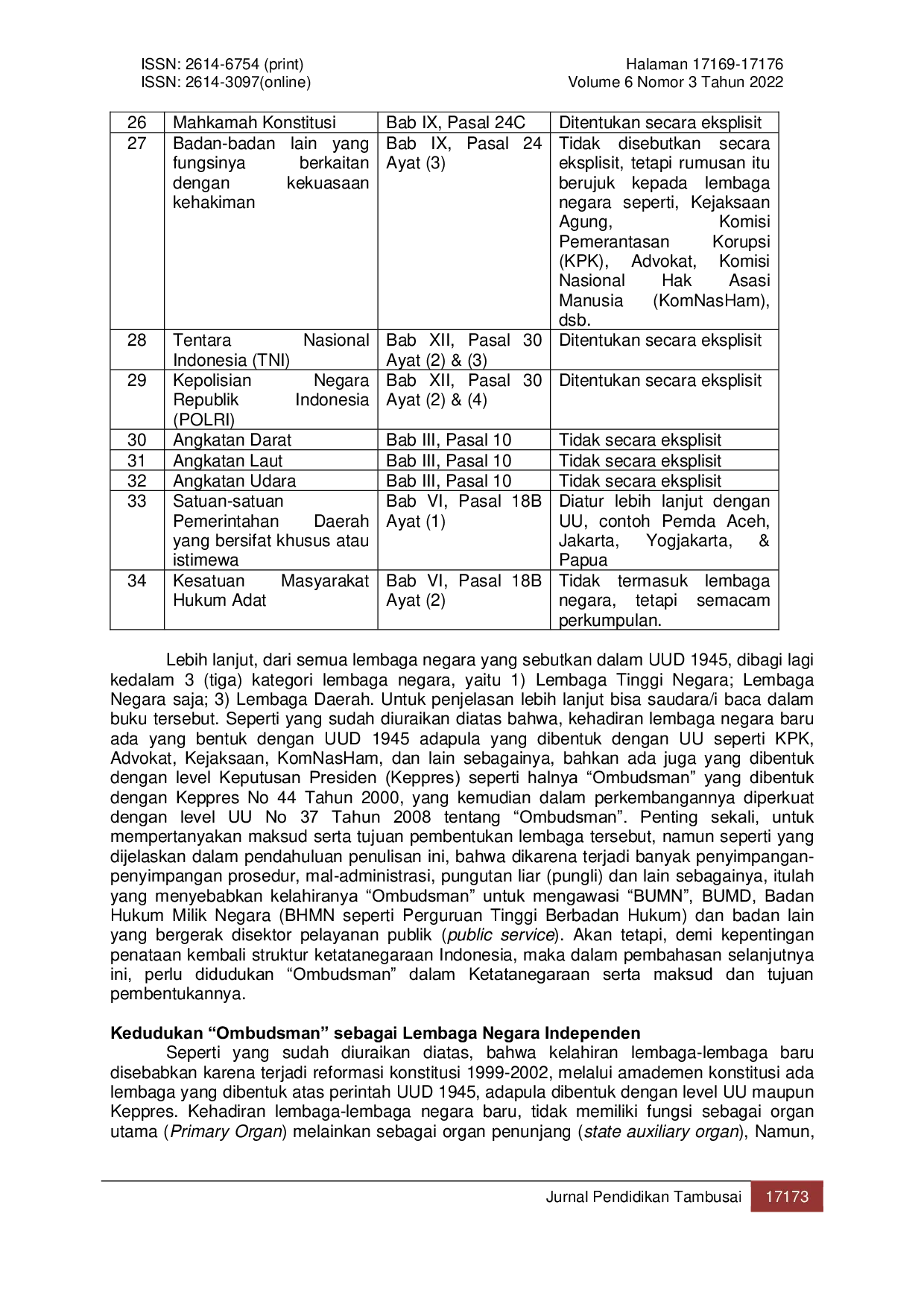 Jurnal Pendidikan TambusaiJurnal Pendidikan TambusaiSetelah reformasi tahun 1999, bermunculan lembaga-lembaga negara baru, seperti Komisi Pemberantasan Korupsi, Komisi Yudisial, termasuk lembaga Ombudsman. Kehadiran lembaga-lembaga tersebut dalam kedudukannya ada yang disematkan sebagai lembaga atau organ penunjang, lembaga independent atau semi-independent. Tujuan Penelitian ini untuk mencari dan mengetahui hakikat kedudukan lembaga Ombudsman serta maksud pembentukannya dalam Struktur Ketatanegaraan. Metode Penelian bersifat normatif, dengan menggunakan pendekatan perundang-undangan dan pendekatan konseptual guna menganalisis permasalahan secara kualitatif. Hasil dan Pembahasan menyimpulkan bahwa lembaga kedudukan ombudsman dalam ketatanegaraan Independen yang menjalankan fungsi campuran, yaitu dapat fungsi regulasi, fungsi administratif, dan fungsi penghukuman atau quasi. Maksud pembentukannya dilatarbelakangi ketidakmampuan lembaga negara yang telah ada menangani persoalan mal-administrasi, Korupsi Kolusi Nepotisme, Pungutan liar (pungli), dan lain sebagainya, sehingga telah menghambat terciptanya pelayanan publik yang baik dan bersih. Untuk itulah, Ombudsman hadir untuk mengawasi sektor pelayanan publik (public service) yang diselenggarakan oleh lembaga negara/daerah termasuk BUMN, BUMD, BHMN, Badan Swasta, dan badan lain yang bergerak di sektor pelayanan publik. Dengan maksud semata-mata untuk mewujudkan tujuan bernegara (welfare state).
