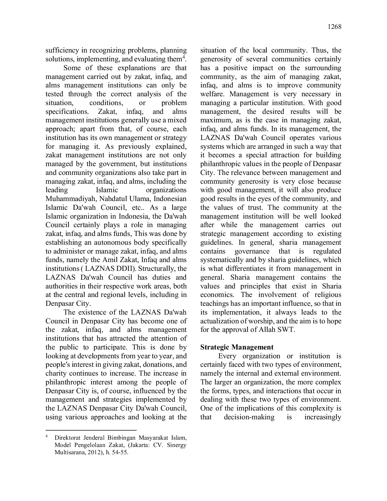 Berdasarkan hasil penelitian dan pembahasan, dapat disimpulkan bahwa strategi LAZNAS Dewan Dakwah dalam mengelola zakat, infaq, dan sedekah mencakup elemen perencanaan, pengorganisasian, pengarahan, dan pengendalian, yang mencerminkan prinsip manajemen organisasi yang baik, yaitu kepercayaan, profesionalisme, dan transparansi.Analisis ekonomi syariah juga dipergunakan sebagai instrumen manajemen strategis, sehingga LAZNAS Dewan Dakwah Kota Denpasar menerapkan prinsip‑prinsip manajemen syariah berupa tanggung jawab, komunikatif, kejujuran (sidq), dan kecerdasan.Penulis menyarankan agar Dewan Dakwah Kota Denpasar meningkatkan strategi pengelolaan zakat, infaq, dan sedekah dengan memperkuat kolaborasi dengan lembaga‑lembaga ZIS, terus meningkatkan minat filantropi masyarakat Denpasar, serta menyelenggarakan simposium untuk merumuskan regulasi dan kerja sama yang lebih baik dalam pengelolaan zakat, infaq, dan sedekah.