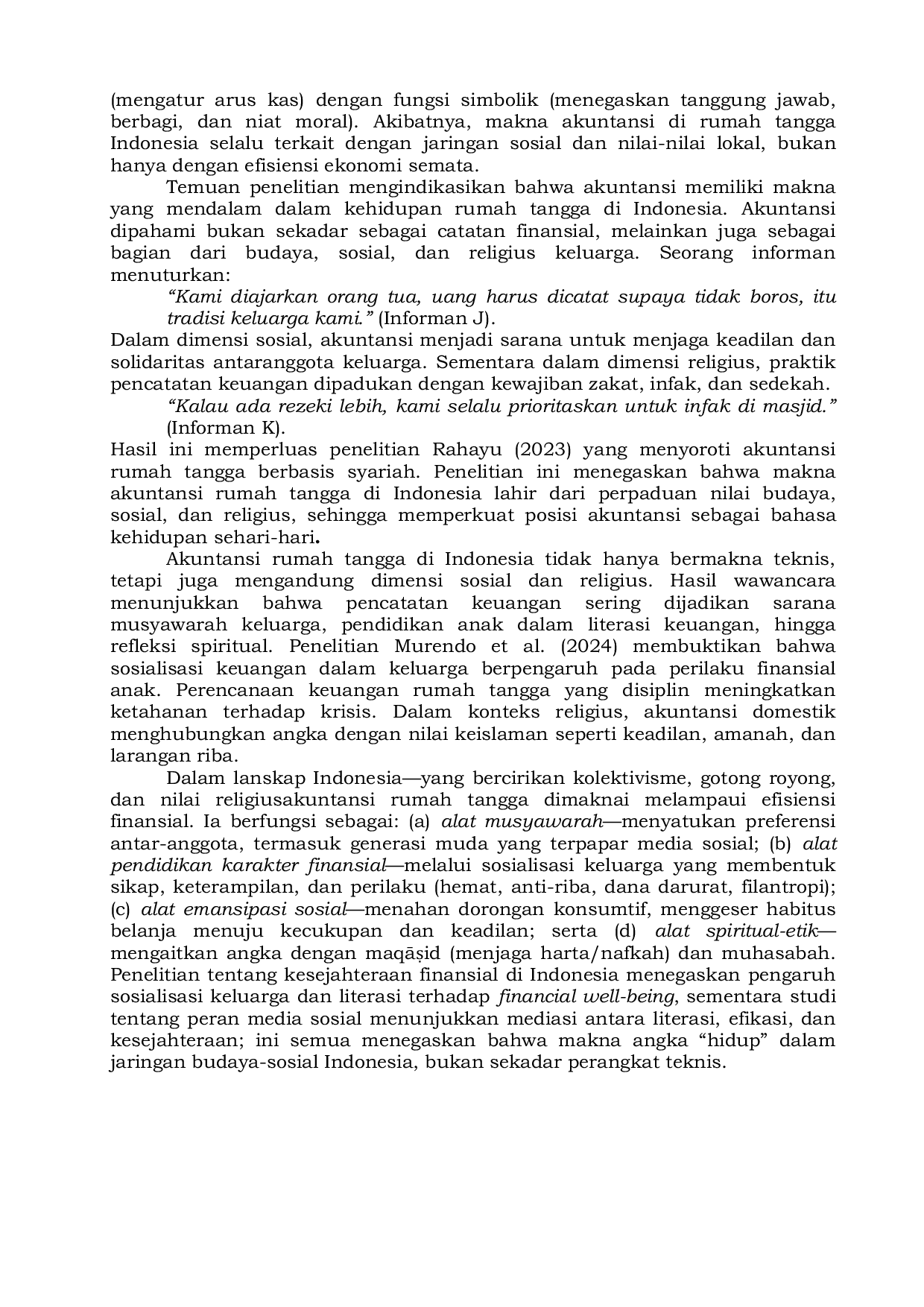 Akuntansi dalam rumah tangga bukan hanya berfungsi sebagai alat pencatatan dan pengelolaan keuangan.Melalui pendekatan multiparadigma, penelitian ini menegaskan bahwa akuntansi rumah tangga juga memainkan peran sosial, kultural, dan spiritual.Praktik akuntansi rumah tangga menjadi bahasa simbolik yang mampu membangun komunikasi, menanamkan nilai, serta memperkuat identitas keluarga.Dengan demikian, akuntansi rumah tangga adalah fenomena multidimensi yang menyatukan aspek teknis, sosial, kritis, postmodern, dan religius.