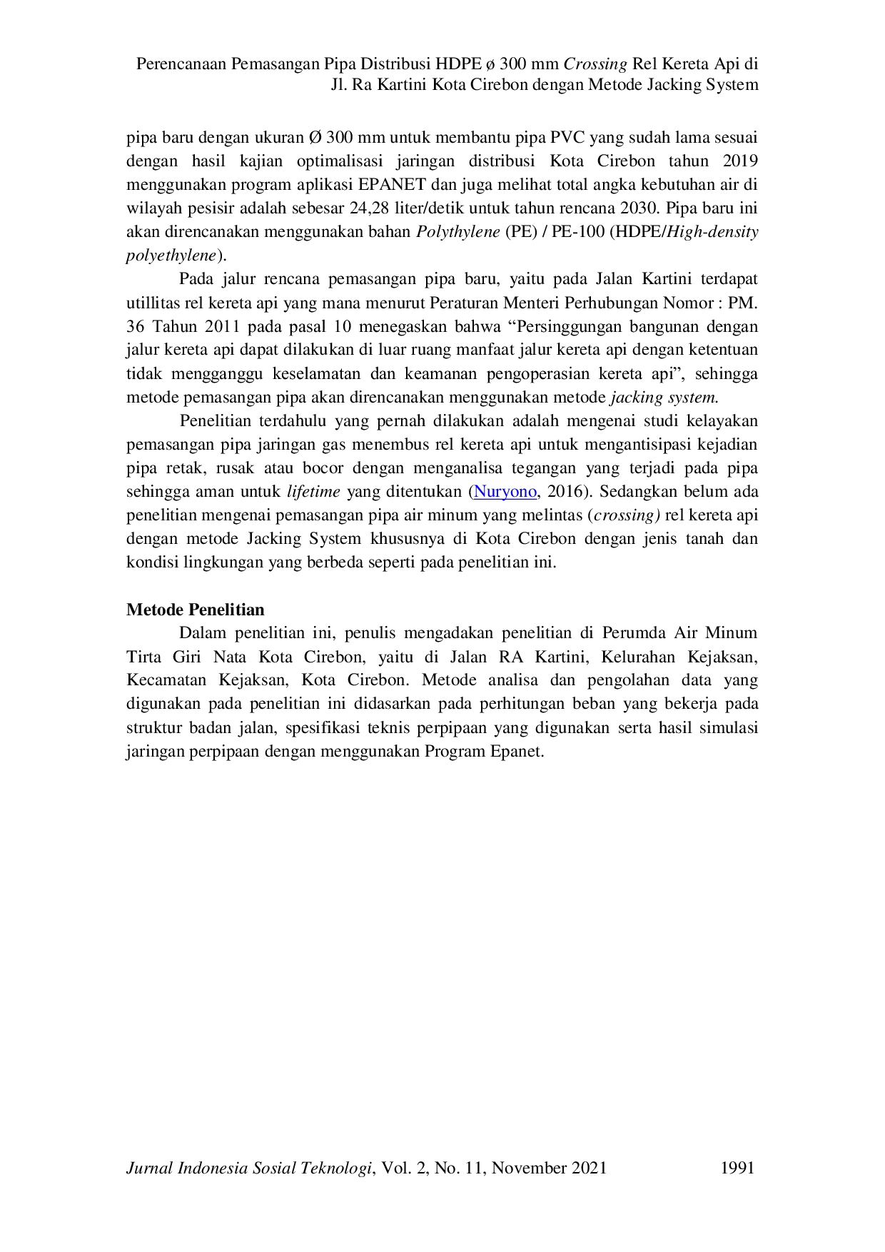 Dari hasil penelitian yang dilakukan, diperoleh kesimpulan bahwa metode Jacking System untuk pemasangan pipa distribusi HDPE Ø 300 mm crossing rel kereta api di Jl.RA Kartini Kota Cirebon memenuhi aspek keamanan konstruksi karena dapat menahan pembebanan yang bekerja pada Pipa Beton tersebut berupa Beban Mati/Statis dan Beban Hidup/Dinamis (beban vertikal) dan beban horizontal karena 9,61 N/cm2 < 4.900 N/cm2 { sangat aman } atau, 0,98 Kg/cm2 < 500 kg/cm2 { sangat aman }.Dari hasil analisis hidrolis pada jam puncak menggunakan program Epenet versi 2.0 menunjukkan bahwa pemasangan pipa baru HDPE dengan ukuran Ø 300 mm dapat meningkatkan pelayanan karena meningkatkan sisa tekan di titik-titik kritis kawasan Wilayah Pusat Pelelangan Ikan Pesisir hingga mencapai > 1 bar, jauh membaik dibandingkan dengan jaringan eksisting sebelum ada pemasangan pipa baru HDPE dengan ukuran Ø 300 mm.