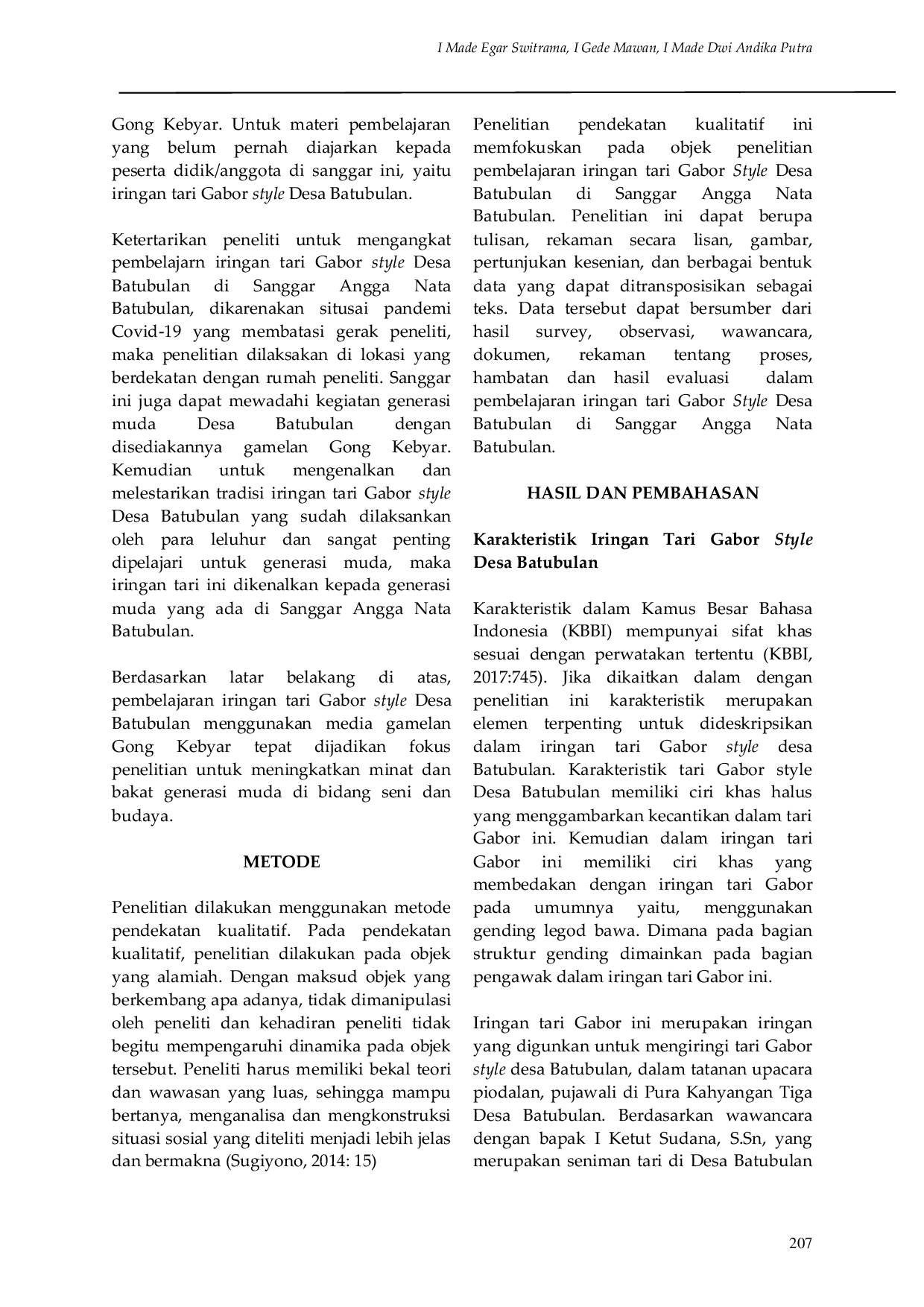 PENSI : Jurnal Ilmiah Pendidikan SeniPENSI : Jurnal Ilmiah Pendidikan SeniPenelitian ini membahas tentang , serta bertujuan untuk mengenalkan dan melestarikan tradisi iringan tari Gabor style Desa Batubulan yang sudah dilaksanakan oleh para leluhur dan sangat penting dipelajari untuk generasi muda. Penelitian ini menggunakan pendekatan kualitatif yang membahas tiga aspek yakni, karakteristik iringan tari Gabor, proses pembelajaran serta faktor penghambat dan pendukung dalam proses . Proses , menggunakan empat tahapan pembelajaran, yaitu: tahap persiapan (preparation), tahap penyampaian (presentation), tahap pelatihan (practice), dan tahap penampilan (performance). Metode yang digunakan dalam pembelajaran iringan tari Gabor yaitu, metode ceramah, demonstrasi, latihan bersama teman dan diskusi. Faktor-faktor yang mempengaruhi proses , yakni adanya faktor pendukung dan faktor penghambat. Faktor pendukung internal yang meliputi minat siswa, motivasi belajar, dan rasa percaya diri. Sedangkan faktor eksternal meliputi faktor dari guru, serta faktor sarana dan prasarana. Faktor penghambat, yaitu faktor siswa juga dapat menghambat terjadi proses pembelajaran, dimana siswa membuat peneliti tidak bisa mengatasi melaksanakan proses pembelajaran kurungarya disiplin saat proses belajar mengajar menjadi faktor penghambat dalam penelitian.