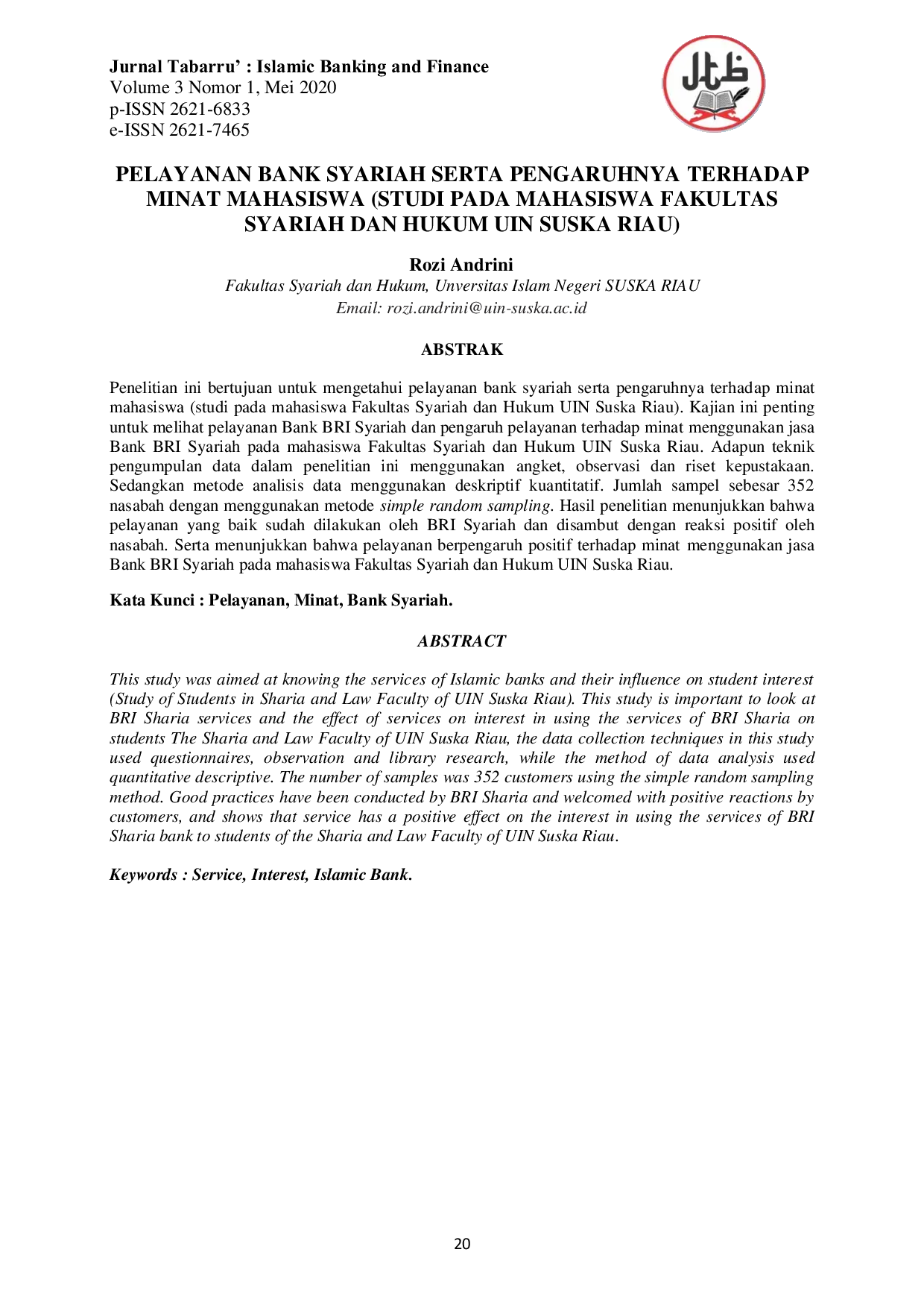 Jurnal Tabarru': Islamic Banking and FinanceJurnal Tabarru': Islamic Banking and FinancePenelitian ini bertujuan untuk mengetahui pelayanan bank syariah serta pengaruhnya terhadap minat mahasiswa (studi pada mahasiswa Fakultas Syariah dan Hukum UIN Suska Riau). Kajian ini penting untuk melihat pelayanan Bank BRI Syariah dan pengaruh pelayanan terhadap minat menggunakan jasa Bank BRI Syariah pada mahasiswa Fakultas Syariah dan Hukum UIN Suska Riau. Adapun teknik pengumpulan data dalam penelitian ini menggunakan angket, observasi dan riset kepustakaan. Sedangkan metode analisis data menggunakan deskriptif kuantitatif. Jumlah sampel sebesar 352 nasabah dengan menggunakan metode simple random sampling. Hasil penelitian menunjukkan bahwa pelayanan yang baik sudah dilakukan oleh BRI Syariah dan disambut dengan reaksi positif oleh nasabah. Serta menunjukkan bahwa pelayanan berpengaruh positif terhadap minat menggunakan jasa Bank BRI Syariah pada mahasiswa Fakultas Syariah dan Hukum UIN Suska Riau.