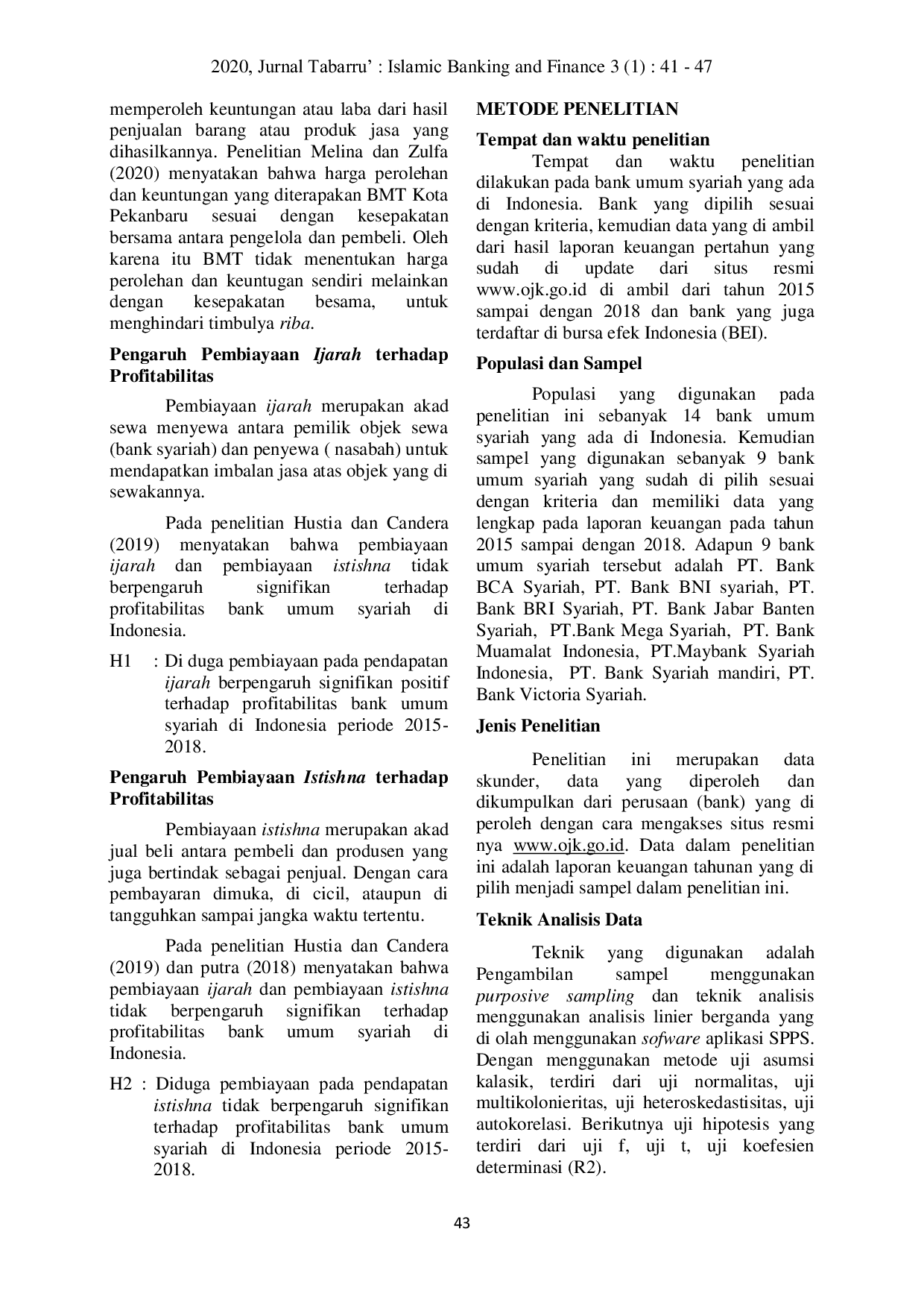 Penelitian ini menunjukkan bahwa pembiayaan ijarah tidak berpengaruh positif terhadap profitabilitas bank umum syariah di Indonesia selama periode 2015-2018.Selain itu, pembiayaan istishna juga tidak berpengaruh positif terhadap profitabilitas bank umum syariah pada periode yang sama.Secara simultan, pembiayaan ijarah dan istishna tidak berpengaruh positif terhadap profitabilitas bank umum syariah di Indonesia pada periode 2015-2018.