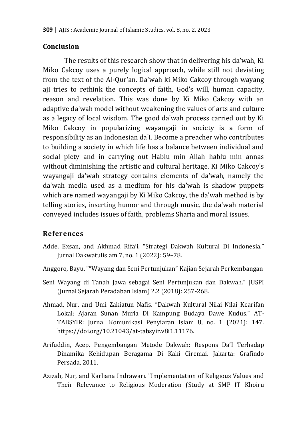 AJIS: Academic Journal of Islamic StudiesAJIS: Academic Journal of Islamic StudiesThe main challenge for the millennial generation in digital development is not to fall victim to the negative side of technological progress. It is feared that this will have implications for the formation of rigid, pragmatic and individualistic personalities. Seeing this, Ki Miko Cakcoy, who is a preacher, uses a cultural approach so that the tausiyah he conveys can be understood, accepted and save the millennial generation from negative media. Ki Miko Cakcoy made Wayang Aji a cultural dawah as a science that could be developed and evaluated. So it seems rational in millennial understanding. In this way, dawah is not left behind as time goes by and is in line with the millennial era. The aim of this research is to examine the cultural dawah strategy used by Ki Miko Cakcoy in preaching amidst millennial modernity. The research method used in writing this article is descriptive qualitative with data collection through interviews, observation and documentation. The results of this research show that in delivering his dawah, Ki Miko Cakcoy uses a purely logical approach, while still not deviating from the text of the Al-Quran. Dawah ki Miko Cakcoy through wayang aji tries to rethink the concepts of faith, Gods will, human capacity, reason and revelation. This was done by Ki Miko Cakcoy with an adaptive dawah model without weakening the values of arts and culture as a legacy of local wisdom.