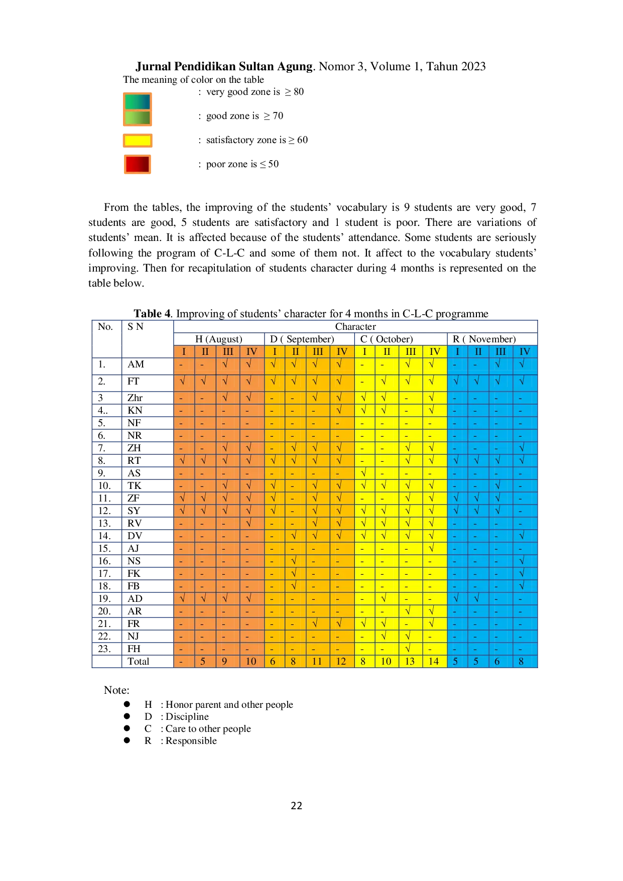 Jurnal Pendidikan Sultan AgungJurnal Pendidikan Sultan AgungThe aim of this research was to describe the activity of C-L-C (Central Learning and Character) program in building character and improving English vocabulary of Elementary School Students. C-L-C Program has created integrated learning activities to build students‟ character and improve English vocabulary for elementary school students. The design of this study was a descriptive qualitative research. The researcher described the activities of English instructor and students in building students character and improving English vocabulary. There was 23 elementary School students had joined on C-L-C program. The techniques for collecting the data were observation, documentation and questionnaire. The finding of this study showed that some activities did by the English instructor on C-L-C program to build the students‟ character and improve the students‟ English vocabulary were reading a text, writing, painting, gaming, pronouncing the new vocabulary, retelling the story, discussing the character value in the story and preparing the students‟ characters‟ book. The result of this study, the C-L-C program had built students‟ character on discipline, responsibility, honor the other people and care to the environment. Besides C-L-C had improved the students‟ English vocabulary, It can be seen from the participation of students in learning process and the recapitulation of the students‟ English test score. It showed that 1 student was poor, 5 students were satisfactory, 8 students were good and 9 students were very good. It can be concluded that C-L-C programme built students‟ character and improved the students‟ English vocabulary.