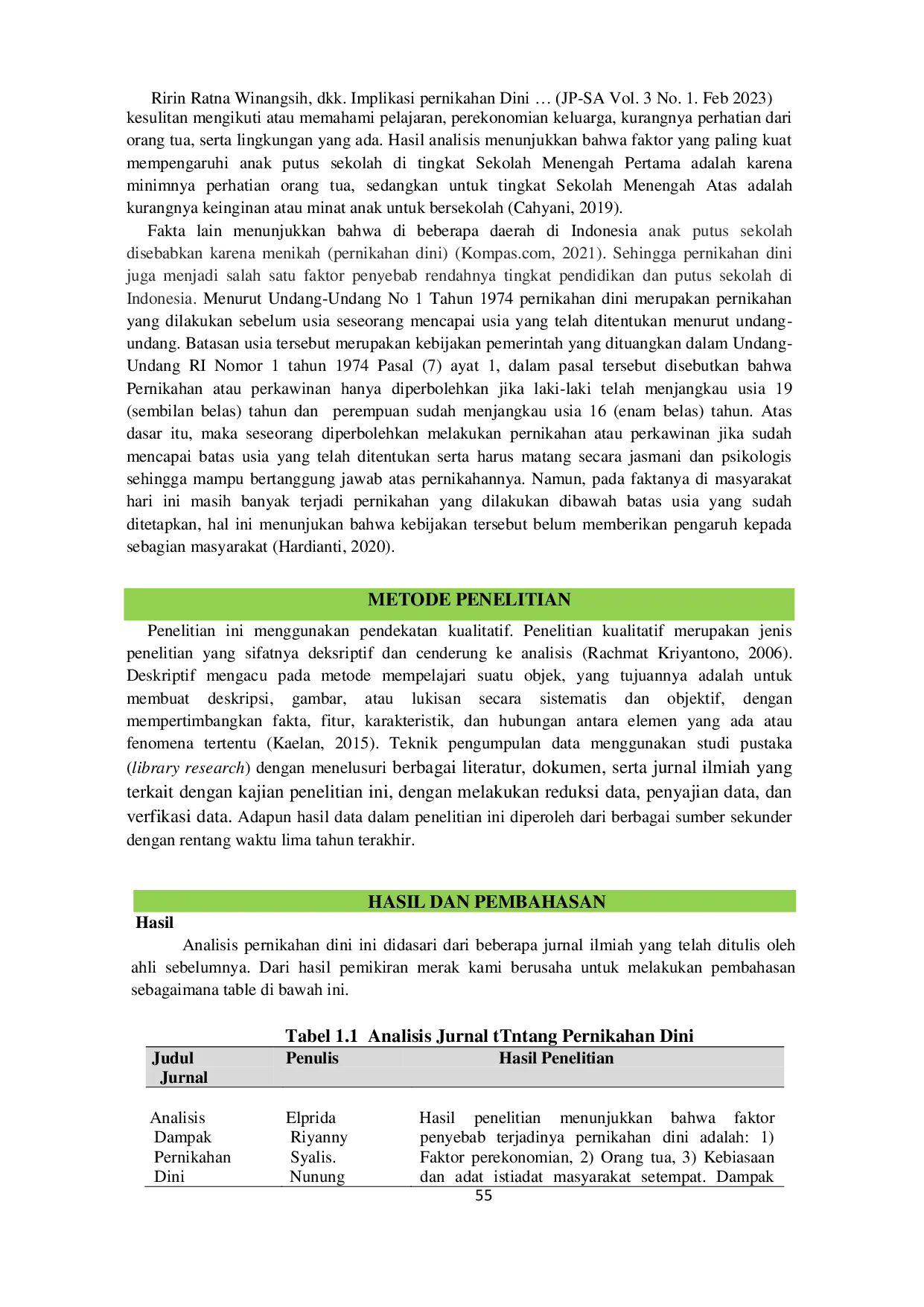 Para ulama sepakat bahwa pernikahan sah bila sudah baligh dan mampu membina rumah tangga, sementara pemerintah menetapkan batas minimal usia 19 tahun.Pernikahan dini dipengaruhi oleh faktor pengetahuan, pendidikan, ekonomi, dan individu, serta menyebabkan hilangnya kesempatan melanjutkan pendidikan, menimbulkan kecemasan, stres, dan trauma pada anak.Selain itu, anak yang menikah dini sering menghadapi masalah keuangan karena kondisi finansial yang tidak stabil.