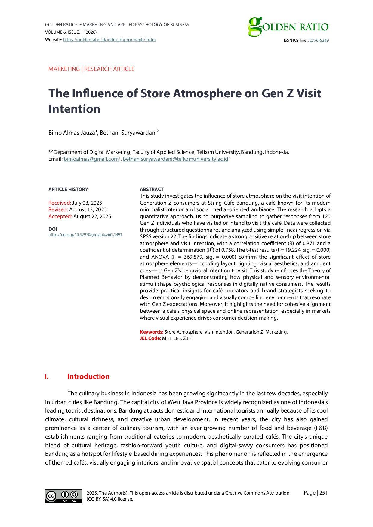 Golden Ratio of Marketing and Applied Psychology of BusinessGolden Ratio of Marketing and Applied Psychology of BusinessThis study investigates the influence of store atmosphere on the visit intention of Generation Z consumers at String Café Bandung, a café known for its modern minimalist interior and social media–oriented ambiance. The research adopts a quantitative approach, using purposive sampling to gather responses from 120 Gen Z individuals who have visited or intend to visit the café. Data were collected through structured questionnaires and analyzed using simple linear regression via SPSS version 22. The findings indicate a strong positive relationship between store atmosphere and visit intention, with a correlation coefficient (R) of 0.871 and a coefficient of determination (R²) of 0.758. The t-test results (t = 19.224, sig. = 0.000) and ANOVA (F = 369.579, sig. = 0.000) confirm the significant effect of store atmosphere elements—including layout, lighting, visual aesthetics, and ambient cues—on Gen Zs behavioral intention to visit. This study reinforces the Theory of Planned Behavior by demonstrating how physical and sensory environmental stimuli shape psychological responses in digitally native consumers. The results provide practical insights for café operators and brand strategists seeking to design emotionally engaging and visually compelling environments that resonate with Gen Z expectations. Moreover, it highlights the need for cohesive alignment between a cafés physical space and online representation, especially in markets where visual experience drives consumer decision-making.