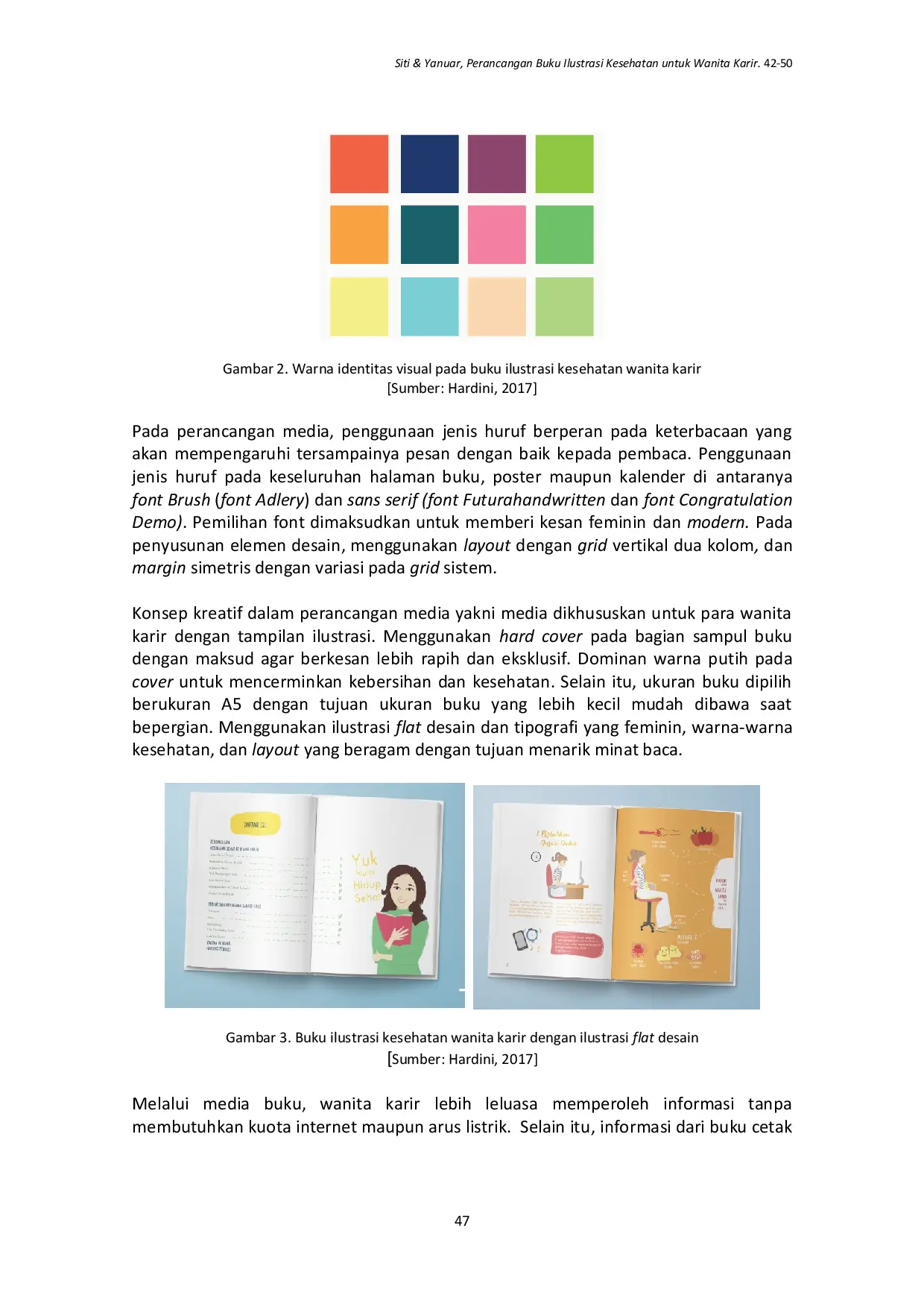 ANDHARUPA: Jurnal Desain Komunikasi Visual & MultimediaANDHARUPA: Jurnal Desain Komunikasi Visual & MultimediaRutinitas masyarakat dalam bekerja dapat menjadikan kurangnya perhatian masyarakat terhadap pola hidup. Kurangnya aktivitas fisik, kebutuhan gizi yang belum terpenuhi, istirahat yang tidak teratur dan lainnya dapat menimbulkan gangguan kesehatan khususnya pada wanita serta mempengaruhi produktivitas dalam bekerja. Hal inilah yang akan dibahas dalam karya ini. Perancangan menggunakan buku kesehatan dalam mengajak kalangan pekerja menjalani hidup sehat. Konten dan ilustrasi disesuaikan agar dapat menyampaikan pola hidup sehat dengan menyenangkan. Observasi, studi pustaka, wawancara serta kuesioner dilakukan sebagai metode dalam mengumpulkan data serta metode matriks dalam menganalisis buku. Buku kesehatan ini diharapkan dapat mengajak masyarakat khususnya kalangan wanita karir untuk tetap menjaga pola hidupnya dengan baik, sehingga dapat mengurangi resiko terkena penyakit dan dapat bekerja secara produktif.