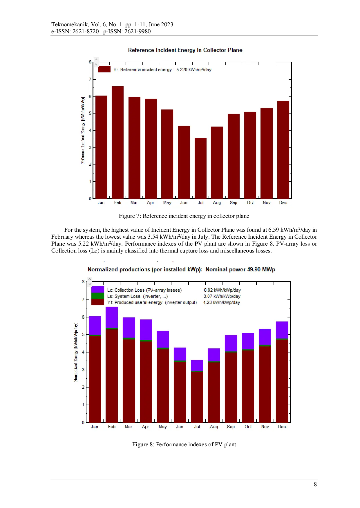 TeknomekanikTeknomekanikListrik merupakan sumber energi penting dalam kehidupan sehari-hari. Dalam beberapa dekade terakhir, meningkatnya permintaan energi di seluruh dunia telah secara signifikan memacu produksi energi, menyebabkan dampak lingkungan seperti pemanasan global dan pengurangan lapisan ozon. Hal ini juga mengancam spesies. Oleh karena itu, seluruh dunia mulai beralih menuju pembangkitan energi hijau, menghilangkan semua dampak negatif terhadap lingkungan. Energi surya adalah sumber energi yang paling hemat emisi CO2 dibandingkan sumber energi tidak terbarukan. Generator surya berguna di daerah yang terpapar sinar matahari secara maksimal. Artikel ini bertujuan untuk mengevaluasi total jumlah energi yang dihasilkan oleh sistem surya yang terhubung ke jaringan pada garis transmisi 230 kV. Hasil ini diperoleh dengan membandingkan energi yang dihasilkan dengan sudut kemiringan 15°, 20°, 25°, 30°, dan 35°. Berdasarkan hasil simulasi, energi terbesar dihasilkan dengan sudut kemiringan 25°. Simulasi dilakukan menggunakan PVsyst. Artikel ini menyajikan produksi energi dari sistem fotovoltaik 40-MW yang terhubung ke jaringan di Minbu Township, Myanmar. Simulasi dilakukan untuk mendapatkan produksi energi maksimal, radiasi insiden, rasio kinerja, energi masuk ke jaringan, dan kerugian energi. Berdasarkan hasil simulasi, disimpulkan bahwa produksi energi maksimal dan rasio kinerja adalah 75730 MWh dan 81% selama setahun. Emisi CO2 yang dihemat adalah 424781,5 ton per tahun. Energi insiden di bidang kolektor adalah 5,220 kWh/m²/hari. Penelitian ini hanya dilakukan untuk analisis sistem utilitas skala besar surya PV terhubung ke jaringan dan tidak menyediakan teknik lanjutan.