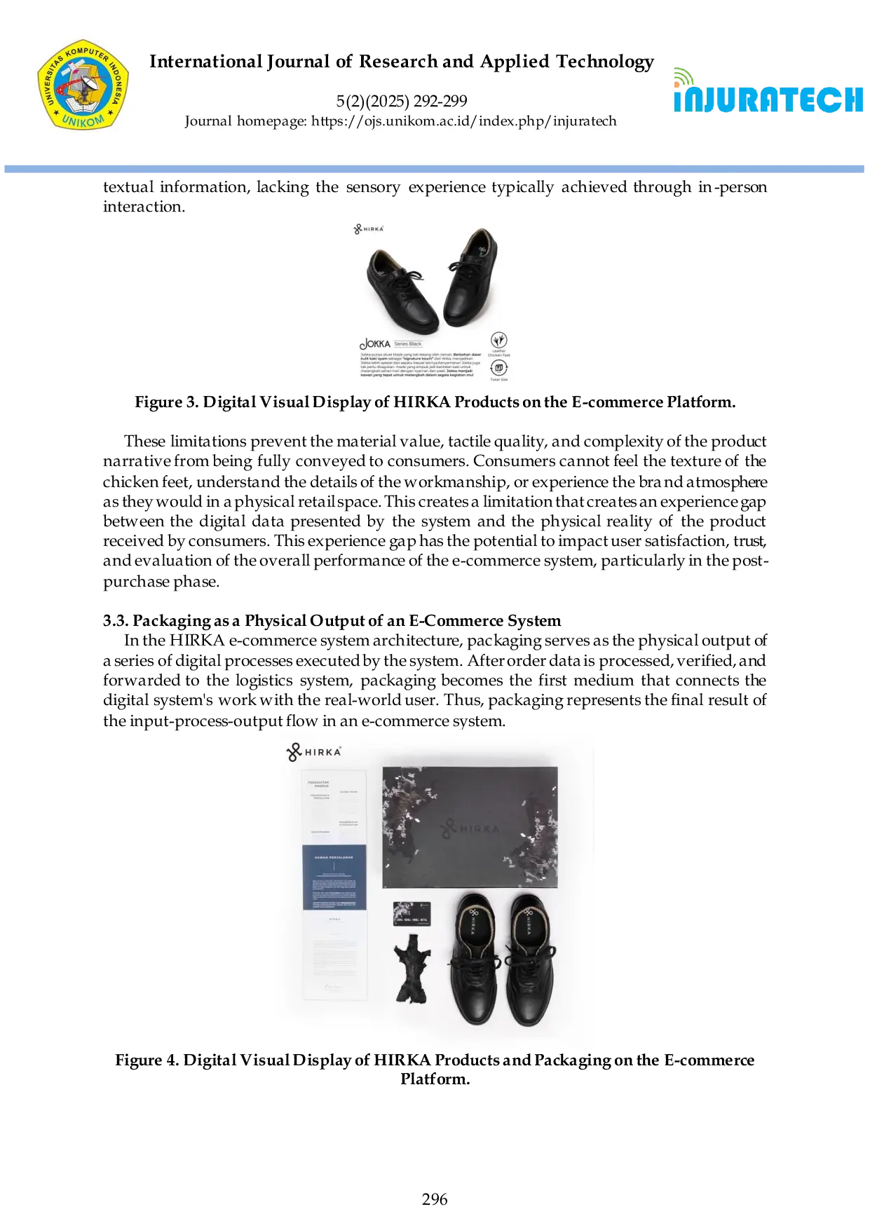 International Journal of Research and Applied Technology (INJURATECH)International Journal of Research and Applied Technology (INJURATECH)The development of e-commerce as an applied information system has changed the interaction pattern between brands and consumers, where user experiences are increasingly mediated by non-physical digital processes. This condition creates limitations in conveying material value, product quality, and brand character, especially for products that emphasize material aspects and an artisan approach. This study aims to analyze the role of packaging as a physical output in the e-commerce system architecture and its contribution to enhancing the customer experience value of the local leather shoe brand HIRKA. The study uses a qualitative approach with a case study method. Data collection was carried out through observations of the marketplace system and HIRKA packaging design, in-depth interviews with brand owners, and literature studies related to e-commerce information systems and technology-based customer experience. The results show that packaging functions as an extension of the information system that translates data, visual representations, and digital narratives into a physical post-purchase experience. The integration between the e-commerce system and packaging design creates continuity between the digital process and the physical output, narrowing the gap in user experience, and increasing customer perceptions of value, trust, and satisfaction. These findings emphasize that evaluation of e-commerce system performance needs to consider the quality of integration between the digital system and the physical output as part of the overall customer experience.