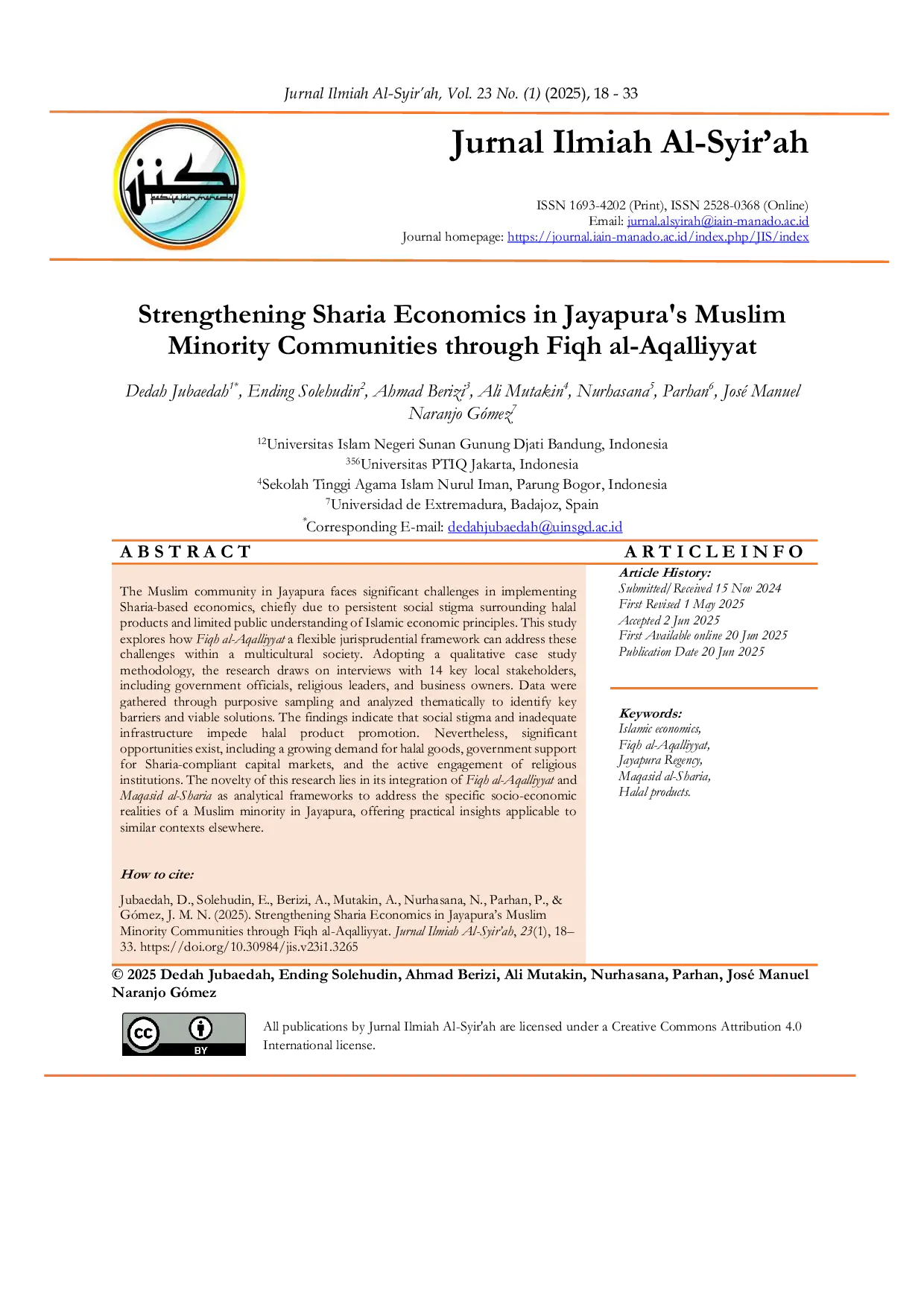 Jurnal Ilmiah Al-Syir'ahJurnal Ilmiah Al-Syir'ahKomunitas Muslim di Jayapura menghadapi tantangan signifikan dalam menerapkan ekonomi syariah, terutama karena stigma sosial yang berkelanjutan terhadap produk halal dan pemahaman publik yang terbatas tentang prinsip-prinsip ekonomi Islam. Penelitian ini mengeksplorasi bagaimana Fiqh al-Aqalliyyat, kerangka kerja yurisprudensi yang fleksibel, dapat mengatasi tantangan ini dalam masyarakat multikultural. Mengadopsi metodologi studi kasus kualitatif, penelitian ini memanfaatkan wawancara dengan 14 pemangku kepentingan lokal kunci, termasuk pejabat pemerintah, pemimpin agama, dan pemilik bisnis. Data dikumpulkan melalui sampling purposive dan dianalisis secara tematis untuk mengidentifikasi hambatan kunci dan solusi yang layak. Temuan menunjukkan bahwa stigma sosial dan infrastruktur yang tidak memadai menghambat promosi produk halal. Namun, peluang juga ada, termasuk permintaan yang tumbuh untuk barang halal, dukungan pemerintah untuk pasar modal syariah, dan keterlibatan aktif institusi agama. Keunikan penelitian ini terletak pada integrasinya Fiqh al-Aqalliyyat dan Maqasid al-Sharia sebagai kerangka analisis untuk mengatasi realitas sosio-ekonomi spesifik komunitas Muslim minoritas di Jayapura, menawarkan wawasan praktis yang dapat diterapkan pada konteks serupa di tempat lain.