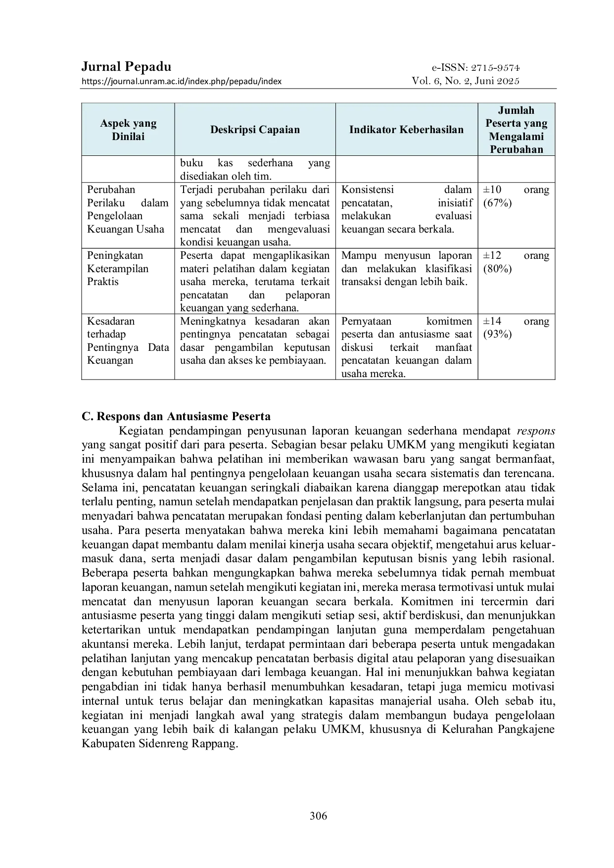 Jurnal PepaduJurnal PepaduKesadaran akan pentingnya literasi keuangan bagi pelaku UMKM menuntut adanya intervensi yang tepat, berupa edukasi yang komprehensif dan pendampingan yang berkelanjutan. Kegiatan pengabdian kepada masyarakat ini bertujuan untuk meningkatkan kapasitas pelaku Usaha Mikro, Kecil, dan Menengah (UMKM) dalam hal pencatatan dan pelaporan keuangan sederhana. Pelaksanaan dilakukan di Kelurahan Pangkajene, Kabupaten Sidenreng Rappang, dengan melibatkan 15 pelaku UMKM dari sektor makanan, kerajinan, dan jasa. Metode yang digunakan meliputi identifikasi masalah, pelatihan akuntansi dasar, praktik pencatatan keuangan, serta pendampingan intensif secara individu dan kelompok. Hasil kegiatan menunjukkan peningkatan pemahaman peserta terhadap konsep dasar akuntansi dan kemampuan menyusun laporan laba rugi sederhana serta catatan kas harian. Selain itu, peserta menunjukkan respon positif dan komitmen untuk menerapkan pencatatan keuangan secara berkelanjutan. Meskipun demikian, masih ditemukan tantangan dalam konsistensi pencatatan dan pemahaman istilah akuntansi. Kegiatan ini membuktikan bahwa pendekatan praktis dan berbasis pendampingan efektif dalam meningkatkan kapasitas keuangan pelaku UMKM.