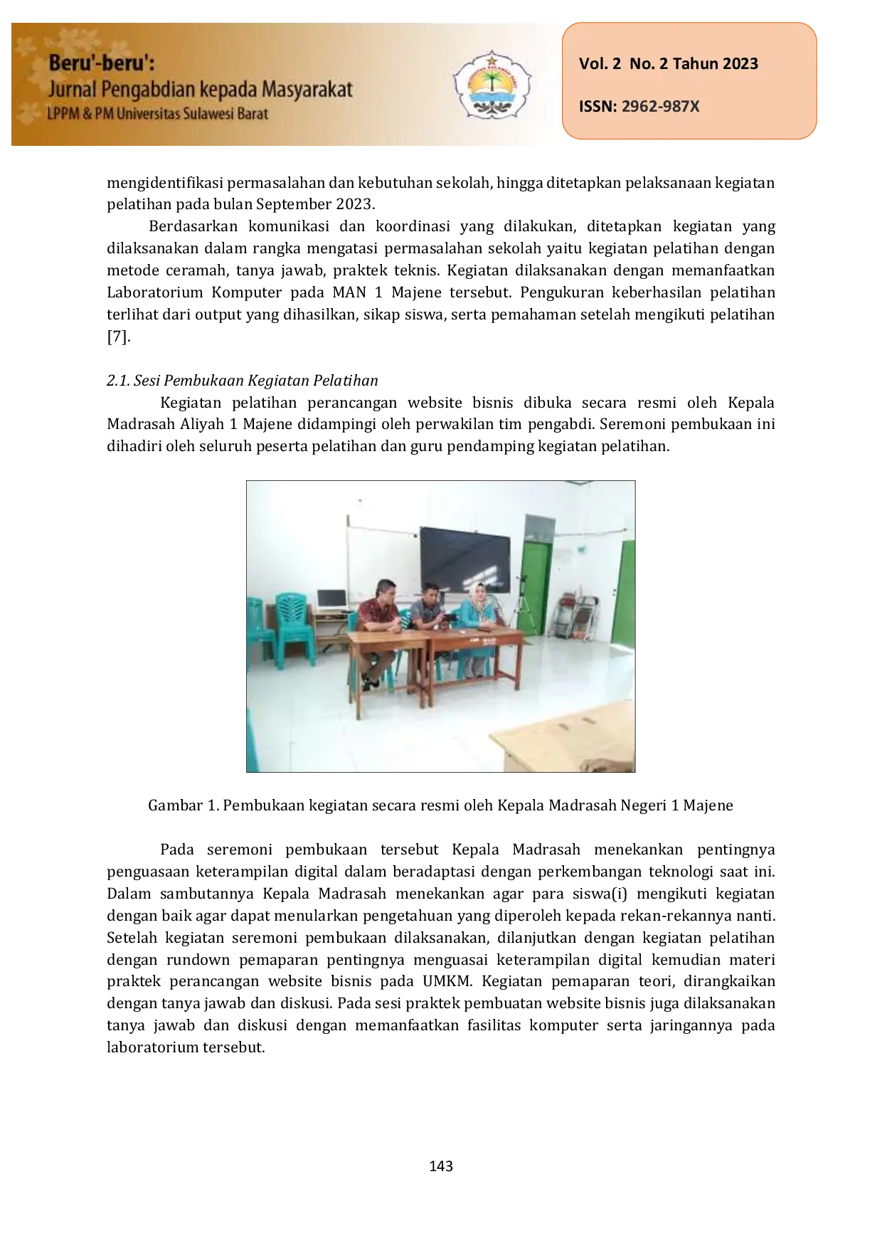Beru'-beru': Jurnal Pengabdian kepada MasyarakatBeru'-beru': Jurnal Pengabdian kepada MasyarakatKegiatan ini bertujuan untuk meningkatkan kemampuan siswa MAN 1 Majene, Sulawesi Barat agar dapat memiliki kapabilitas digital dalam menghadapi perkembangan dunia saat ini. Permasalahan yang dihadapi siswa Man 1 Majene adalah kurangnya kemampuan untuk berpartisipasi dan mengikuti perkembangan dunia digital terutama pemanfaatan platform digital untuk kegiatan ekonomi. Setelah mengikuti kegiatan ini, siswa MAN Majene diharapkan dapat memiliki keterampilan membuat website bisnis sederhana yang memanfaatkan dalam menunjang kegiatan bisnis keluarga. Subjek kegiatan ini adalah siswa(i) MAN 1 Majene yang terletak di Kabupaten Majene, Provinsi Sulawesi Barat. Jumlah peserta sebanyak 20 orang dari berbagai jurusan pada sekolah Madrasah. Kegiatan pelatihan dilaksanakan selama satu hari dengan metode pendampingan, ceramah, tanya jawab dan praktik. Hasil pelatihan : (1) Siswa(i) memiliki kemampuan merancang website bisnis sederhana, (2) Siswa(i) memiliki pemahaman teknik pemasaran secara digital, (3) Siswa(i) memiliki kemampuan teknis melakukan optimasi website secara organik.