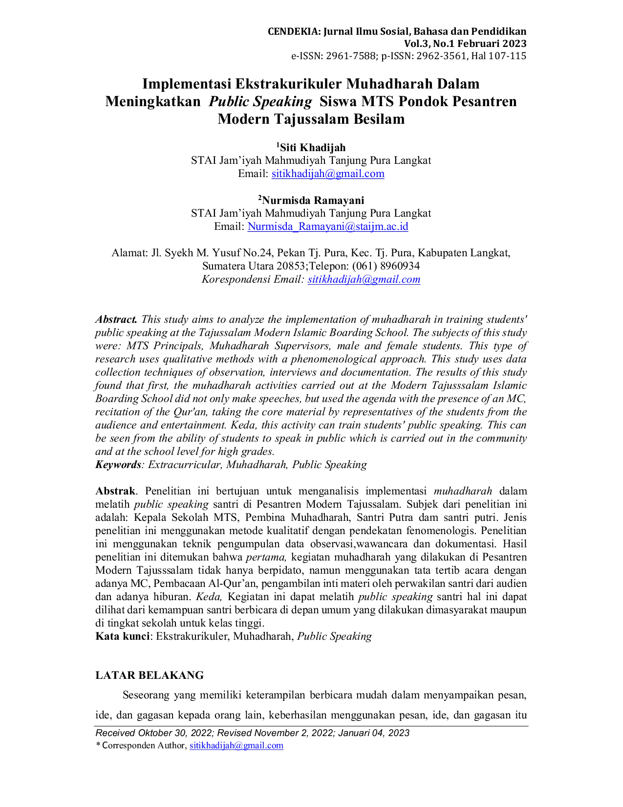 CENDEKIA: Jurnal Ilmu Sosial, Bahasa dan PendidikanCENDEKIA: Jurnal Ilmu Sosial, Bahasa dan PendidikanPenelitian ini bertujuan untuk menganalisis implementasi muhadharah dalam melatih public speaking santri di Pesantren Modern Tajussalam. Subjek dari penelitian ini adalah: Kepala Sekolah MTS, Pembina Muhadharah, Santri Putra dam santri putri. Jenis penelitian ini menggunakan metode kualitatif dengan pendekatan fenomenologis. Penelitian ini menggunakan teknik pengumpulan data observasi, wawancara dan dokumentasi. Hasil penelitian ini ditemukan bahwa pertama, kegiatan muhadharah yang dilakukan di Pesantren Modern Tajussalam tidak hanya berpidato, namun menggunakan tata tertib acara dengan adanya MC, Pembacaan Al-Quran, pengambilan inti materi oleh perwakilan santri dari audien dan adanya hiburan. Keda, Kegiatan ini dapat melatih public speaking santri hal ini dapat dilihat dari kemampuan santri berbicara di depan umum yang dilakukan dimasyarakat maupun di tingkat sekolah untuk kelas tinggi.
