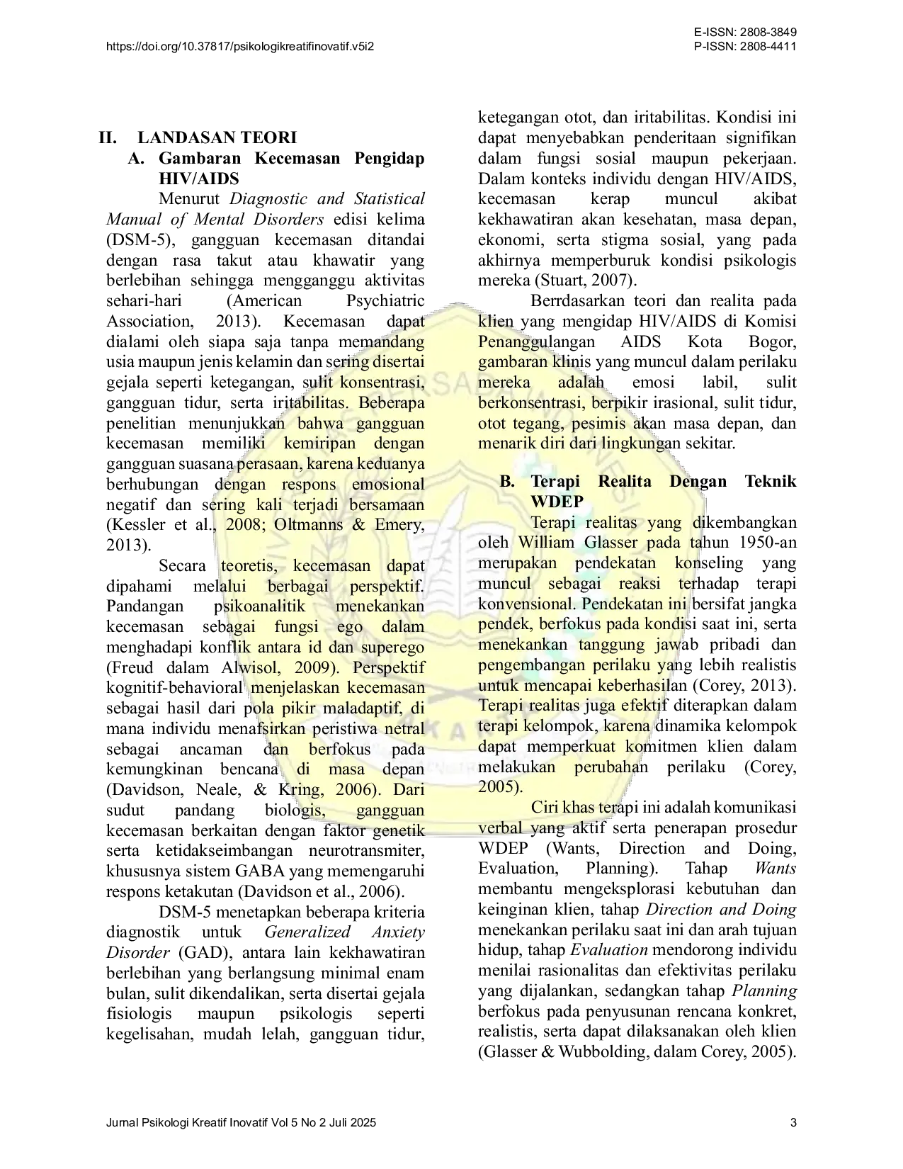 Psikologi Kreatif InovatifPsikologi Kreatif InovatifHuman Immunodeficiency Virus (HIV) tidak hanya berdampak pada kesehatan fisik, tetapi juga menimbulkan tekanan psikologis berupa kecemasan yang dapat mengganggu fungsi sosial dan kualitas hidup penderita. Penelitian ini bertujuan untuk mengetahui gambaran klinis kecemasan pada pengidap HIV/AIDS serta efektivitas penerapan terapi realita dengan teknik WDEP dalam mengatasi kecemasan pada klien di Komisi Penanggulangan AIDS (KPA) Kota Bogor. Penelitian menggunakan desain kuasi-eksperimental dengan metode pre-post test with control group terhadap lima klien. Instrumen pengukuran kecemasan menggunakan Hamilton Anxiety Rating Scale (HARS), serta didukung data hasil wawancara, observasi, dan tes psikologi. Hasil penelitian menunjukkan bahwa sebelum intervensi, rata-rata skor kecemasan berada pada kategori berat (M = 34). Setelah penerapan terapi realita kelompok dengan teknik WDEP, terjadi penurunan skor kecemasan menjadi rata-rata 20,6 (kategori sedang) dengan penurunan sebesar 40,2%. Klien juga menunjukkan perubahan positif berupa stabilitas emosi, kemampuan konsentrasi, berpikir lebih rasional, tidur lebih baik, serta peningkatan optimisme. Temuan ini mengindikasikan bahwa terapi realita dengan teknik WDEP efektif dalam menurunkan tingkat kecemasan dan meningkatkan kesejahteraan psikologis pengidap HIV/AIDS.