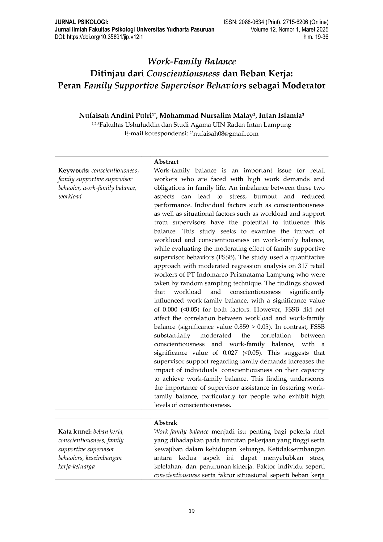 Penelitian ini menunjukkan bahwa work-family balance secara signifikan dipengaruhi oleh conscientiousness dan beban kerja, meskipun family supportive supervisor behaviors tidak memoderasi hubungan antara beban kerja dan work-family balance.Family supportive supervisor behaviors justru memperkuat hubungan antara conscientiousness dan work-family balance.Perusahaan, khususnya di sektor ritel, disarankan untuk lebih memperhatikan faktor psikologis seperti manajemen waktu, dukungan sosial, stres kerja, serta mengembangkan program pengembangan diri yang berfokus pada peningkatan karakteristik seperti disiplin dan tanggung jawab.Selain itu, menciptakan lingkungan kerja yang mendukung kesehatan mental, misalnya melalui layanan konseling, dapat membantu karyawan mencapai work-family balance yang lebih baik.