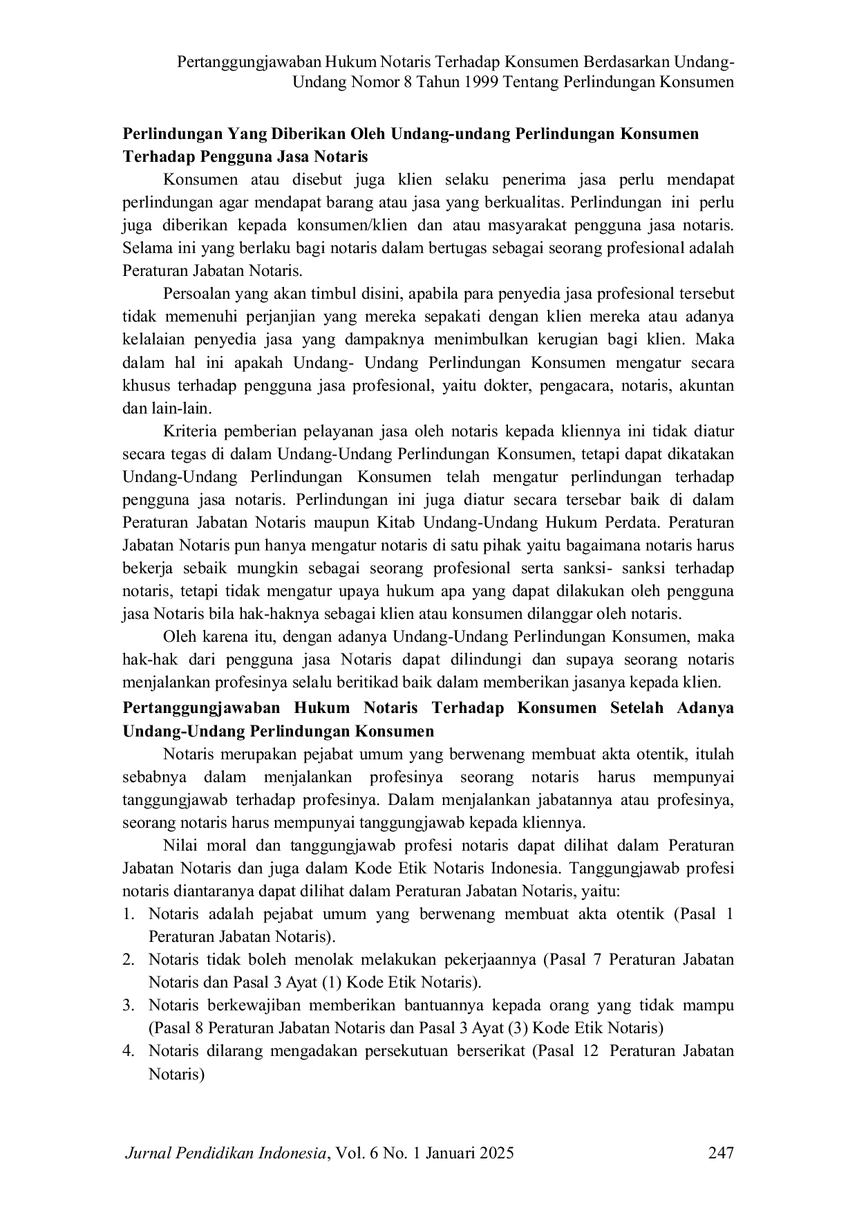 Jurnal Pendidikan IndonesiaJurnal Pendidikan IndonesiaNotaris sebagai pejabat publik memiliki peran penting dalam memberikan pelayanan hukum kepada masyarakat, termasuk konsumen. Dalam pelaksanaan tugasnya, notaris wajib menjamin bahwa akta dan dokumen yang dibuat sesuai dengan ketentuan hukum yang berlaku. Namun, muncul pertanyaan mengenai sejauh mana notaris bertanggung jawab jika terjadi kerugian bagi konsumen akibat kesalahan atau kelalaian dalam pembuatan untuk menganalisis akta. Pertanggungjawaban hukum notaris berdasarkan Undang-Undang Nomor 8 Tahun 1999 tentang Perlindungan Konsumen. Metode penelitian yang digunakan adalah yuridis normatif dengan pendekatan peraturan perundang-undangan dan studi literatur. Hasil penelitian menunjukkan bahwa notaris dapat dikenai pertanggungjawaban hukum jika terbukti melanggar kewajiban profesinya, terutama apabila terjadi kesalahan yang merugikan konsumen. Undang-Undang Perlindungan Konsumen memberikan dasar bagi konsumen untuk menuntut ganti rugi, termasuk hak atas keamanan, informasi yang benar, dan perlakuan yang jujur dari penyedia jasa, termasuk notaris. Selain itu, penelitian ini menemukan adanya kolaborasi antara Undang-Undang Jabatan Notaris dan Undang-Undang Perlindungan Konsumen dalam memastikan akuntabilitas dan perlindungan hukum bagi konsumen. Penelitian ini merekomendasikan agar notaris meningkatkan kepatuhan terhadap kode etik dan standar profesional dalam memberikan layanan kepada konsumen. Selain itu, konsumen perlu lebih memahami hak-haknya dan jalur hukum yang tersedia jika mengalami kerugian akibat tindakan notaris. Dengan demikian, hubungan yang adil dan seimbang antara notaris dan konsumen dapat tercipta, sejalan dengan prinsip perlindungan konsumen.