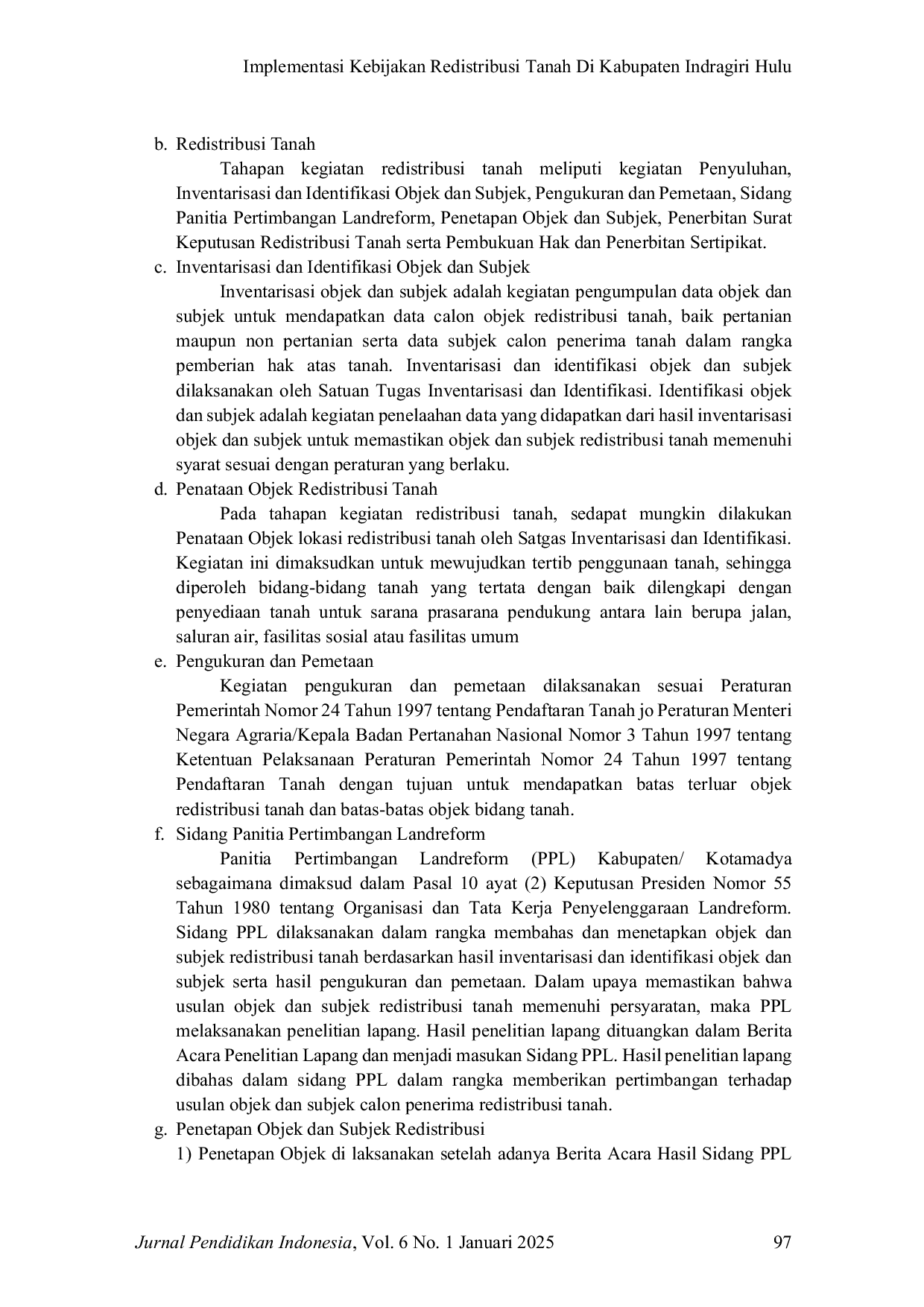 Jurnal Pendidikan IndonesiaJurnal Pendidikan IndonesiaTujuan dari penelitian ini adalah untuk mengetahui dan untuk mengetahui faktor-faktor yang mempengaruhi implementasi kebijakan redistribusi tanah di Indragiri Hulu di Kelurahan Pangkalan Kasai Kecamatan Seberida dan Desa Pauh Ranap Kecamatan Peranap Kabupaten Indragiri Hulu. Penelitian ini menggunakan metode kualitatif atau naturalistik karena dilakukan pada kondisi yang alamiah karena penelitian ini mengeksplor deskripsi dampak dari . Hasil penelitian menunjukkan bahwa pelaksanaan redistribusi tanah di Kabupaten Indragiri Hulu sudah terimplementasi dengan baik, akan tetapi perlunya evaluasi dalam siklus kinerja yang meliputi komunikasi, sumberdaya, disposisi dan struktur birokrasi agar pelaksanaan redistribusi tanah teklaksana secara optimal dan efesien sesuai dengan arahan Perpres No. 62 Tahun 2023 Tentang Percepatan Reforma Agraria hasil penyempurnaan dari Perpres No. 86 Tahun 2018 Tentang Reforma Agraria sehingga pada tahapan lanjut dari kegiatan redistribusi tanah tersebut memberikan dampak positif dan efektif sehingga banyaknya kelompok tani dan UMKM yang tersingkronisasi dengan program pemerintah daerah yang menjadikan nilai tambah pada prospek usahanya melalui PTM. Selain itu juga terimplementasinya target sasaran dari Perpres No. 62 Tahun 2023 Tentang Percepatan Reforma Agraria yang meliputi: (a) mengurangi ketimpangan penguasaan dan pemilikan tanah dalam rangka menciptakan keadilan, (b) menangani Sengketa dan Konflik Agraria, (c) menciptakan sumber kemakmuran dan kesejahteraan masyarakat yang berbasis agraria melalui pengaturan penguasaan, pemilikan, penggunaan dan pemanfaatan tanah, (d) menciptakan lapangan kerja untuk mengurangi kemiskinan, (e) memperbaiki akses masyarakat kepada sumber ekonomi, (f) meningkatkan ketahanan dan kedaulatan pangan, (g) memperbaiki dan menjaga kualitas lingkungan hidup.