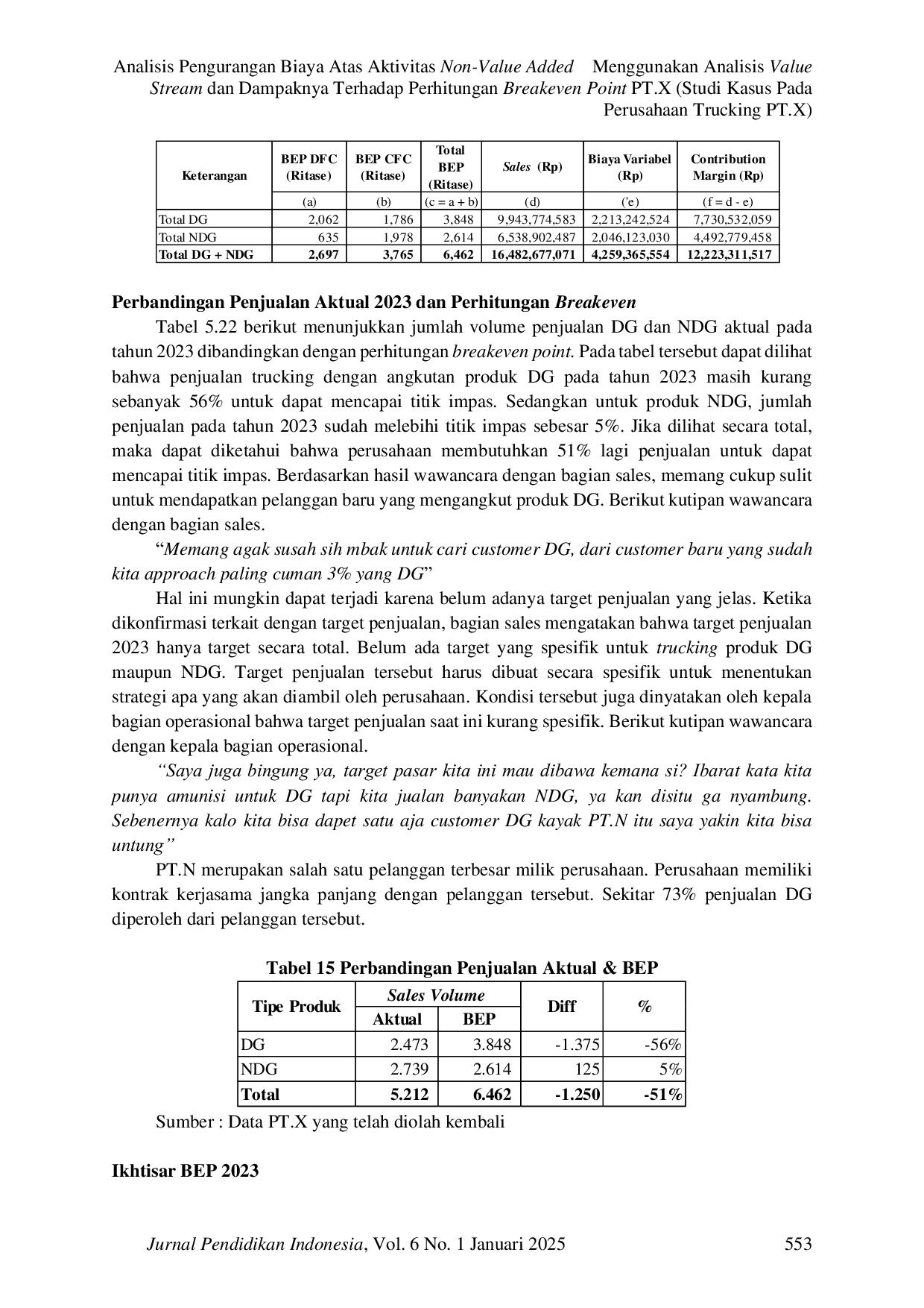 Jurnal Pendidikan IndonesiaJurnal Pendidikan IndonesiaPenelitian ini dilakukan pada perusahaan jasa trucking PT.X yang mengalami kerugian selama lima tahun terakhir. Tujuan penelitian ini adalah memberikan solusi melalui pengurangan biaya dan penentuan titik breakeven. Penelitian ini menggunakan metode kualitatif dengan analisis value stream dan breakeven point. Analisis value stream digunakan untuk mengidentifikasi aktivitas non-value added yang dapat dieliminasi atau dikurangi, sedangkan analisis breakeven point digunakan untuk menentukan volume penjualan yang dibutuhkan perusahaan untuk mencapai titik impas. Hasil penelitian menunjukkan bahwa pengurangan biaya atas aktivitas non-value added dapat menurunkan titik breakeven perusahaan.