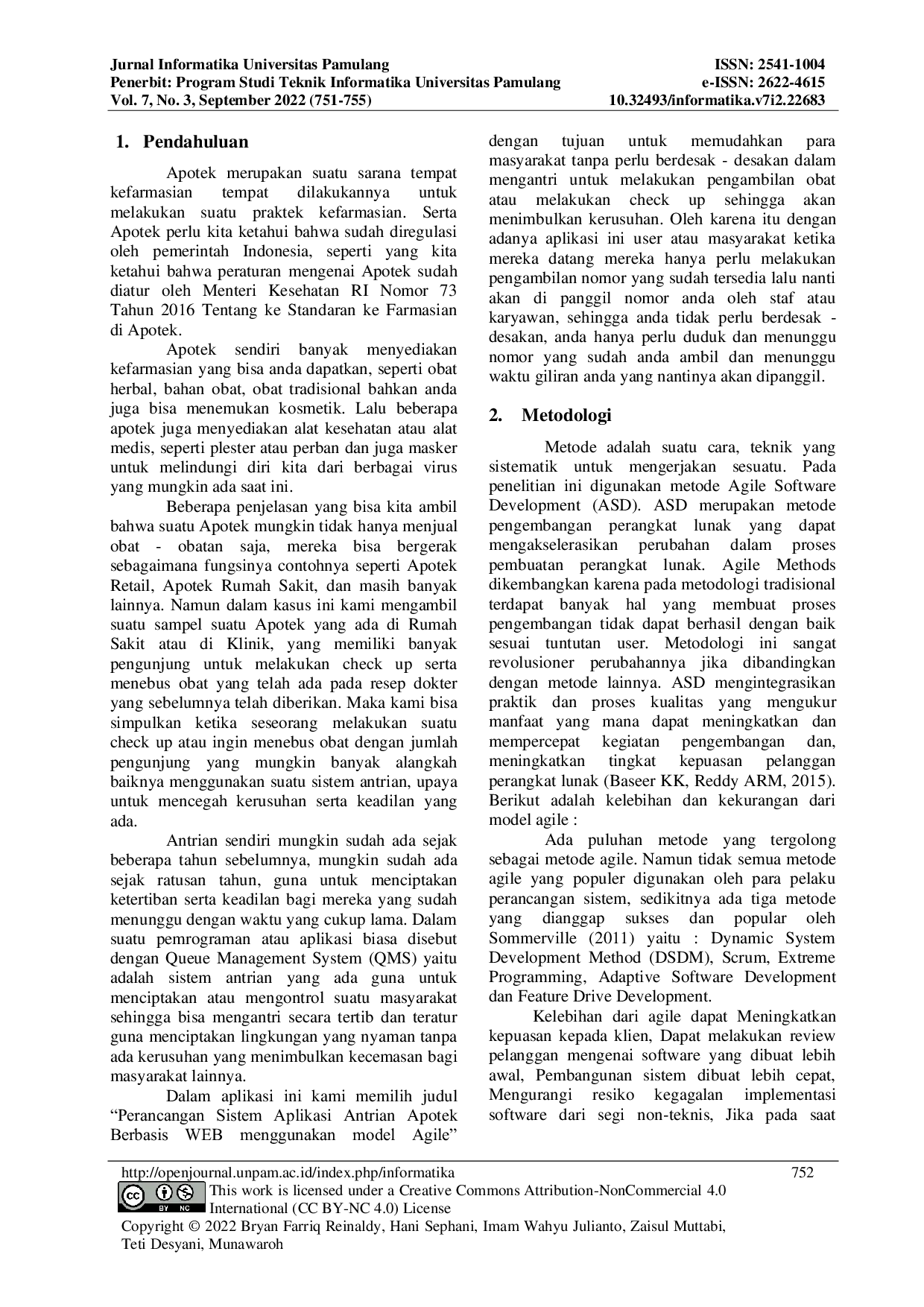 Jurnal Informatika Universitas PamulangJurnal Informatika Universitas PamulangTeknologi saat ini tidak terhindarkan untuk dihentikan Salah satu area utama di pengembangan teknologi adalah teknologi informasi. Itu menjadi sangat melekat kehidupan sehari-hari di segala usia. Website sendiri merupakan suatu aplikasi yang dimana menampilkan suatu tampilan dengan berbagai macam, bertujuan untuk berbagi informasi sehingga user bisa menggunakannya dengan mudah dan juga dapat dipahami dengan baik. Antrian merupakan suatu budaya yang mungkin sudah ada sejak puluhan bahkan ratusan tahun yang lalu. Kata antrian sendiri memiliki arti yaitu, adalah dimana seseorang saling menunggu gilirannya untuk mendapatkan apa yang dia inginkan dengan menunggu giliran dirinya dari orang lain. Antrian ada biasanya seseorang ingin melakukan suatu pelayanan, namun mereka harus menunggu dikarenakan jumlah orang yang begitu banyak. penelitian ini dilakukan untuk menentukan pelayanan yang lebih efisien, efektif dan memuaskan para pengunjung Apotek. Pembatasan masalah dilakukan hanya mencakup tingkat kedatangan, waktu pelayanan, disiplin antrian, dan jumlah fasilitas pelayanan yang tersedia serta proses antrian.