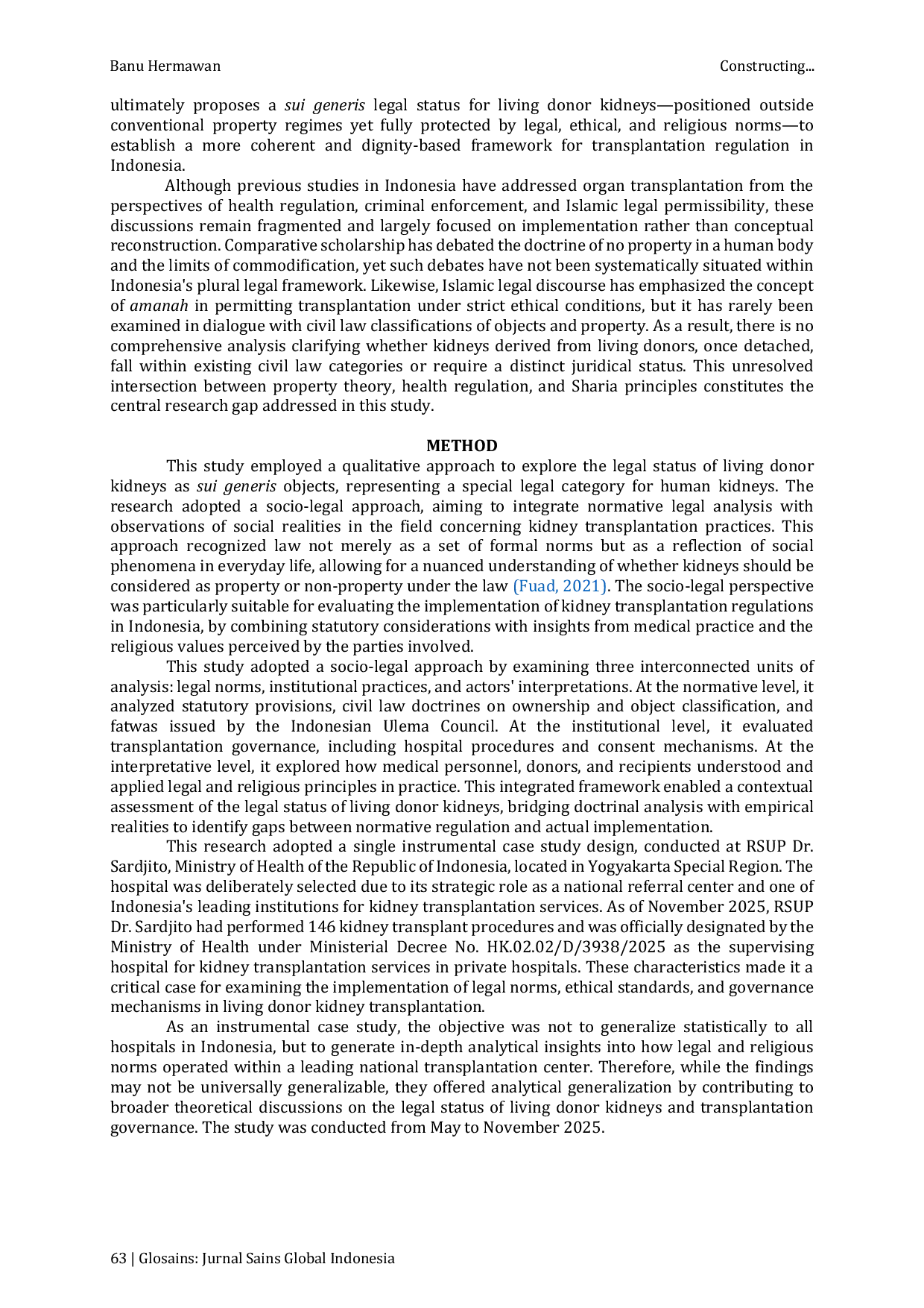 Glosains: Jurnal Sains Global IndonesiaGlosains: Jurnal Sains Global IndonesiaKidney transplantation in Indonesia remains very low (below 3%), despite a growing dialysis population, with 127,900 active patients and 134,057 hemodialysis cases recorded in 2024. Although organ commercialization is legally prohibited, conceptual uncertainty persists in both positive law and Islamic legal perspectives regarding the juridical status of living donor kidneys, affecting regulatory certainty and ethical safeguards in transplantation practice. This study examines whether a kidney separated from a living donor may be classified as an object of property under Indonesian law and explores alternative legal constructions that better reflect human dignity. This research employs a mixed-methods socio-legal approach, integrating doctrinal analysis of Indonesian health legislation, civil law, and Islamic fatwas with 20 semi-structured interviews, observations, and policy document review at a national referral transplant hospital. Indonesian law, bioethical principles, and Maqāṣid al-Sharīʿah consistently reject organ commercialization. Transplantation is legitimate only when conducted voluntarily, for therapeutic purposes, and on a non-commercial basis. As Indonesian regulations neither define the legal status of living donor kidneys nor establish structured donor protection, living donor kidneys should be classified as a sui generis legal entity — neither property nor a transferable commodity, but a specially protected biological entity under public law.