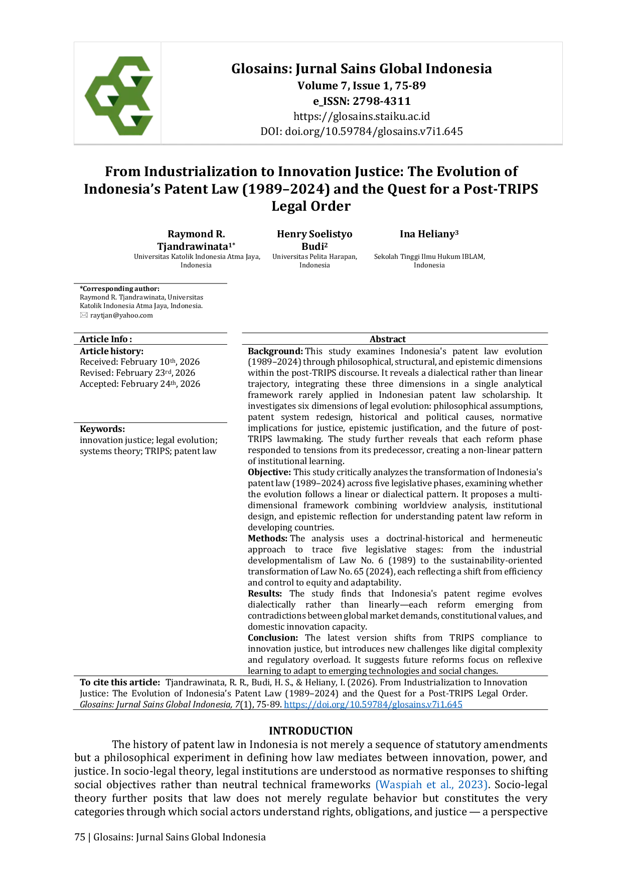 - From Industrialization to Innovation Justice: The Evolution of Indonesia’s Patent Law (1989–2024)... doi.org/10.59784/glosains.v7i1.645From Industrialization to Innovation Justice The Evolution of IndonesiaAos Patent Law 1989Ae2024 doi 10 59784 glosains v7i1 645