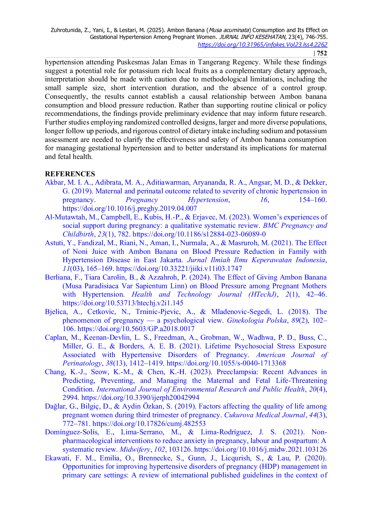 Penelitian ini menemukan bahwa konsumsi pisang Ambon (Musa acuminata) terkait dengan penurunan tekanan darah sistolik dan diastolik pada wanita hamil dengan hipertensi gestasional yang berkunjung ke Puskesmas Jalan Emas di Kabupaten Tangerang.Meskipun temuan ini menunjukkan peran potensial buah lokal yang kaya kalium sebagai pendekatan diet komplementer, interpretasi harus dilakukan dengan hati-hati karena adanya keterbatasan metodologis, termasuk ukuran sampel yang kecil, durasi intervensi yang singkat, dan tidak adanya kelompok kontrol.Oleh karena itu, hasil penelitian ini tidak dapat menetapkan hubungan kausal antara konsumsi pisang Ambon dan penurunan tekanan darah.Sebaliknya, temuan ini memberikan bukti awal yang dapat menginformasikan penelitian selanjutnya.Studi lanjutan yang menggunakan desain acak terkontrol, populasi yang lebih besar dan beragam, jangka waktu yang lebih lama, serta pengendalian yang ketat terhadap asupan diet termasuk penilaian natrium dan kalium diperlukan untuk mengklarifikasi efektivitas dan keamanan konsumsi pisang Ambon dalam mengelola hipertensi gestasional dan memahami implikasinya bagi kesehatan ibu dan janin.