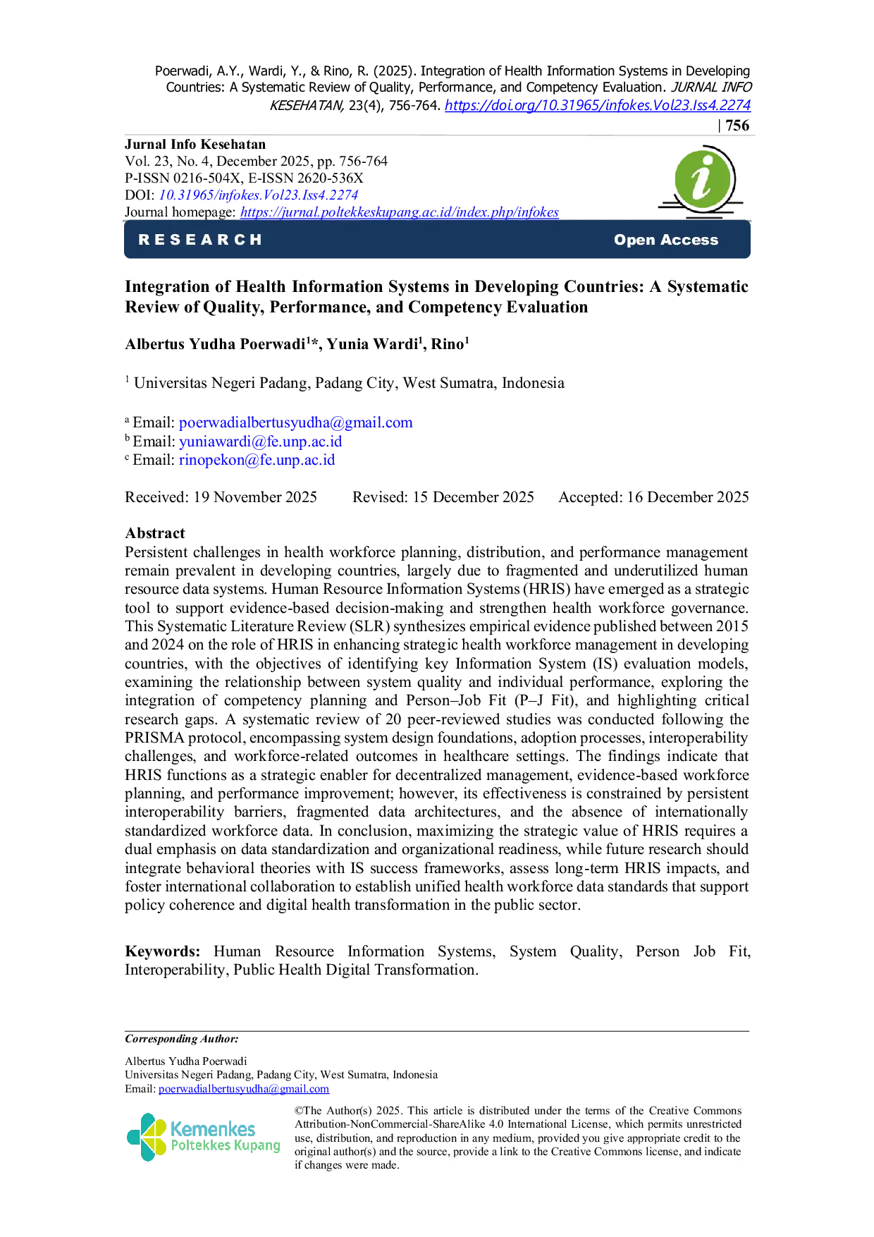 JURNAL INFO KESEHATANJURNAL INFO KESEHATANTantangan yang terus-menerus dalam perencanaan, distribusi, dan manajemen kinerja tenaga kesehatan masih lazim di negara berkembang, sebagian besar karena sistem data sumber daya manusia yang terfragmentasi dan kurang dimanfaatkan. Sistem Informasi Sumber Daya Manusia (SISDM) telah muncul sebagai alat strategis untuk mendukung pengambilan keputusan berbasis bukti dan memperkuat tata kelola tenaga kesehatan. Tinjauan Pustaka Sistematis (SLR) ini mensintesis bukti empiris yang diterbitkan antara tahun 2015 dan 2024 mengenai peran SISDM dalam meningkatkan manajemen tenaga kesehatan strategis di negara berkembang, dengan tujuan mengidentifikasi model evaluasi Sistem Informasi (SI) utama, menguji hubungan antara kualitas sistem dan kinerja individu, mengeksplorasi integrasi perencanaan kompetensi dan Kesesuaian Pribadi-Jabatan (Person–Job Fit/P–J Fit), serta menyoroti kesenjangan penelitian yang kritis. Tinjauan sistematis terhadap 20 studi yang telah ditinjau sejawat dilakukan mengikuti protokol PRISMA, meliputi dasar-dasar desain sistem, proses adopsi, tantangan interoperabilitas, dan hasil terkait tenaga kerja di lingkungan layanan kesehatan. Temuan menunjukkan bahwa SISDM berfungsi sebagai pendorong strategis untuk manajemen terdesentralisasi, perencanaan tenaga kerja berbasis bukti, dan peningkatan kinerja; namun, efektivitasnya dibatasi oleh hambatan interoperabilitas yang terus-menerus, arsitektur data yang terfragmentasi, dan tidak adanya data tenaga kerja yang terstandardisasi secara internasional. Sebagai kesimpulan, memaksimalkan nilai strategis SISDM membutuhkan penekanan ganda pada standardisasi data dan kesiapan organisasi, sementara penelitian di masa depan harus mengintegrasikan teori perilaku dengan kerangka kerja keberhasilan SI, menilai dampak jangka panjang SISDM, dan mendorong kolaborasi internasional untuk menetapkan standar data tenaga kesehatan terpadu yang mendukung koherensi kebijakan dan transformasi kesehatan digital di sektor publik.