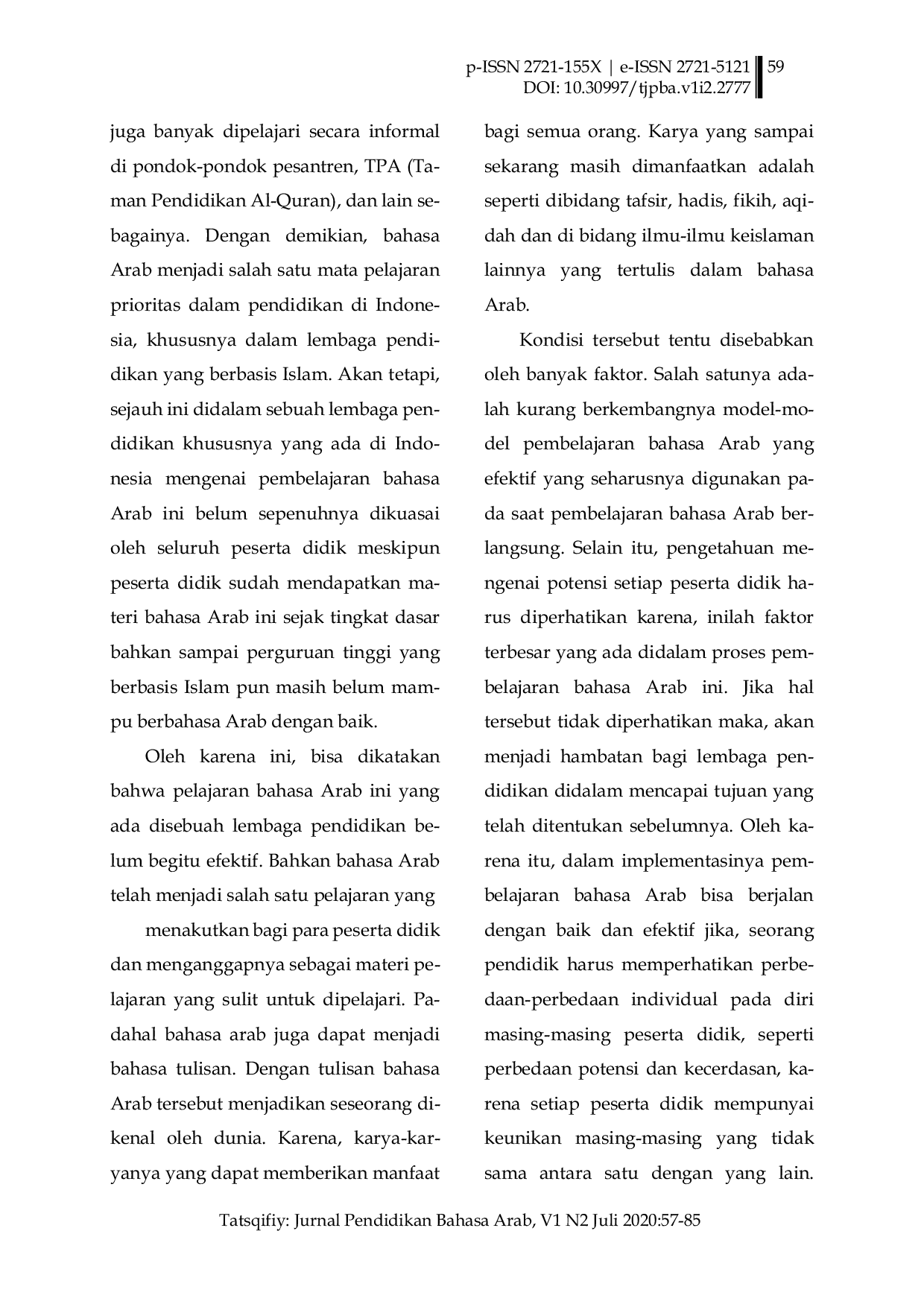 Pendidikan merupakan ujung tombak dalam menciptakan generasi yang unggul maka, peran guru pun harus dapat dikembangkan dalam proses pembelajaran yang dilaksanakan pada satuan lembaga pendidikan.Terutama pada mata pelajaran bahasa Arab yang harus menjadi perhatian pada lembaga pendidikan Islam seperi Madrasah Ibtidaiyah.Karena, bahasa Arab yang tidak semua peserta didik menyukainya.Oleh karena itu, model pembelajaran pun harus disesuaikan dengan materi pembelajaran tersebut.Di samping itu, setiap peserta didik tentulah berbeda-beda dalam menyerap setiap pembelajaran.Oleh karena itu, seorang guru bukan menuntut peserta didik untuk mampu menguasai semua materi pembelajaran apalagi pada mata pelajaran bahasa Arab yang sering kali dihindari oleh peserta didik karena, kejenuhan yang ada pada materi tersebut.Akan tetapi, seorang guru mampu mengembangkan bakat dan kemampuan yang dimiliki oleh peserta didik karena, setiap orang pasti mempunyai salah satu kecerdasan yang lebih dominan ada pada diri seseorang, diantaranya adalah kecerdasan verbal-linguistik, matematis-logis, kinestetik, spasial, musikal, eksistensial, naturalis, interpersonal, dan intrapersonal.Oleh karena itu, penulis menganalisis bahwa terdapat kecerdasan yang sesuai dengan materi pada mata pelajaran bahasa Arab kelas 4 semester satu/ganjil di Madrasah yang berada pada Silabus dan Rencana Pelaksanaan Pembelajaran/RPP.Secara garis besar memberikan pemahaman kepada penulis bahwa pada materi yang dibahas terdapat kecerdasan peserta didik yang lebih menonjol yaitu kecerdasan verbal-linguistik, kecerdasan spasial, kecerdasan interpersonal dan kecerdasan intrapersonal.Dimana keempat kecerdasan ini yang lebih dominan ada pada peserta didik sesuai dengan materi tersebut.Sehingga seorang guru mampu melihat model pembelajaran yang cocok dan tepat dalam proses pembelajaran tersebut jika dilihat dari Multiple Intelligences yang dimiliki setiap peserta didik.Dalam memahami konsep Multiple Intelligences ini beserta karakteristik didalamnya akan mempermudah seorang guru dalam mengembangkan materi tersebut dengan menyesuaikan kecerdasan yang dimiliki peserta didik dengan beberapa strategi pembelajaran bahkan menggunakan model pembelajaran yang cocok dan tepat.Dengan memperhatikan hal-hal tersebut untuk suatu jenjang pendidikan seperti di Madrasah maka, tujuan pembelajaran pun dapat tercapai dengan baik, khususnya didalam mata pelajaran bahasa Arab.