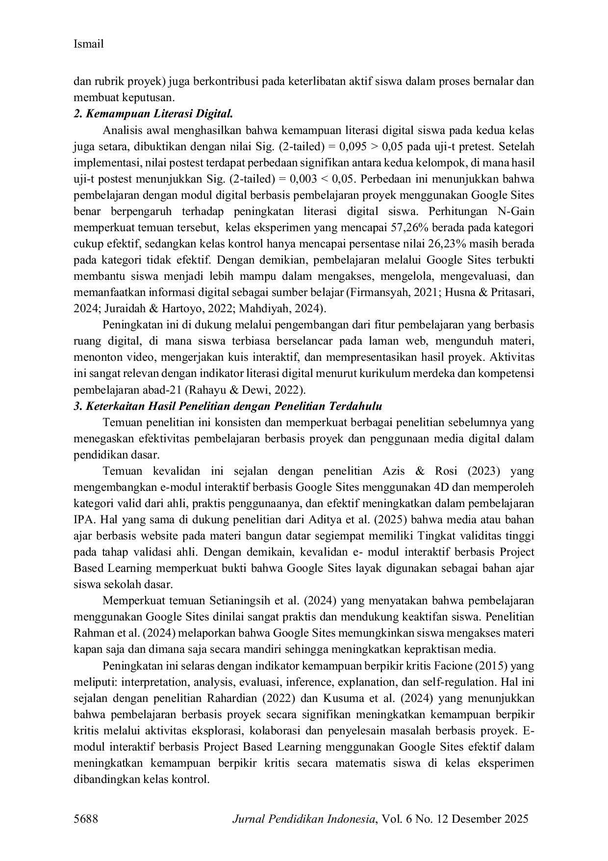 Jurnal Pendidikan IndonesiaJurnal Pendidikan IndonesiaKurikulum Merdeka menuntut pembelajaran yang mendorong fleksibilitas, relevansi, dan berorientasi pada kemampuan abad 21. Namun, praktik pembelajaran di sekolah masih berpusat pada guru dan kemampuan berpikir kritis siswa masih kurang terstimulasi, serta penggunaan teknologi digital yang masih minim. Penelitian ini bertujuan untuk mengembangkan e-modul interaktif berbasis Project Based Learning (PjBL) menggunakan Google Sites yang valid, praktis, dan efektif dalam meningkatkan kemampuan berpikir kritis matematis dan literasi digital siswa kelas IV SD. Pengembangan menggunakan pendekatan model ADDIE dan dilakukan pengujian quasi eksperimen menggunakan kelas kontrol dan kelas eksperimen. Hasil validasi memperoleh kategori sangat valid (92,22% dan 91,67%) dan sangat praktis (56,83 dan 48,00). Efektivitas e-modul interaktif dibuktikan melalui hasil uji-t yang signifikan untuk kemampuan berpikir kritis dengan nilai Sig. 0,013 < 0,05 (terdapat perbedaan signifikan antara kelas eksperimen dan kontrol, dengan selisih rata-rata 9,95 poin lebih tinggi pada kelas eksperimen) dan literasi digital dengan nilai Sig. 0,003 < 0,05 (selisih rata-rata 10,80 poin lebih tinggi pada kelas eksperimen). Nilai N-Gain masing-masing sebesar 0,57 (57,23% - kategori cukup efektif) dan 0,58 (57,60% - kategori cukup efektif) menunjukkan peningkatan kemampuan yang substansial. Implikasi praktis dari e-modul interaktif berbasis PjBL dapat diimplementasikan sebagai alternatif sumber belajar digital yang mendukung pembelajaran aktif, kolaboratif, dan sesuai tuntutan Kurikulum Merdeka, serta dapat meningkatkan kompetensi abad 21 siswa secara terukur. Dengan demikian, e-modul interaktif berbasis Project Based Learning menggunakan Google Sites dinyatakan valid, praktis, dan efektif dalam meningkatkan kemampuan berpikir kritis matematis serta literasi digital siswa kelas IV SD.