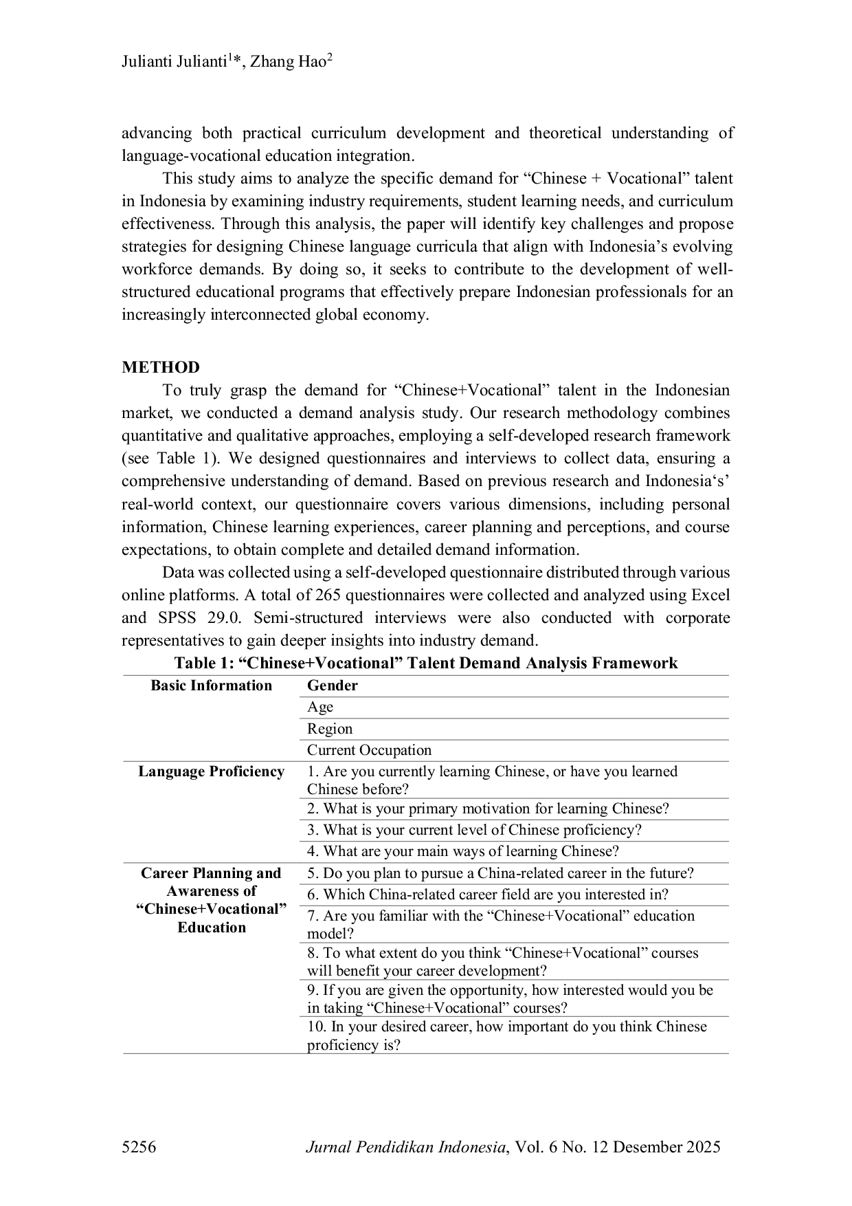 Jurnal Pendidikan IndonesiaJurnal Pendidikan IndonesiaPenelitian ini menyelidiki permintaan akan talenta Chinese Vocational di Indonesia dan jalur untuk pembudidayaannya. Dengan pendekatan campuran yang menggabungkan survei dan wawancara, temuan mengungkapkan kebutuhan signifikan akan talenta tersebut, khususnya di bidang perdagangan, pariwisata, dan industri kecerdasan buatan. Analisis data menggunakan Excel dan SPSS 29.0, ditambah dengan analisis tematik transkrip wawancara, mengungkapkan permintaan yang menonjol di bidang perdagangan (65,8%), pariwisata (58,3%), dan industri kecerdasan buatan (52,1%). Berdasar pada model sosial-pendidikan Gardner dan sistem motivasi diri Dörnyei untuk pembelajaran bahasa kedua, penelitian ini menekankan peran penting motivasi pembelajar. Terutama, 61,9% responden menyebutkan pengembangan karier sebagai motivasi utama mereka dalam belajar bahasa Cina, yang menekankan hubungan kuat antara akuisisi bahasa dan aspirasi profesional.