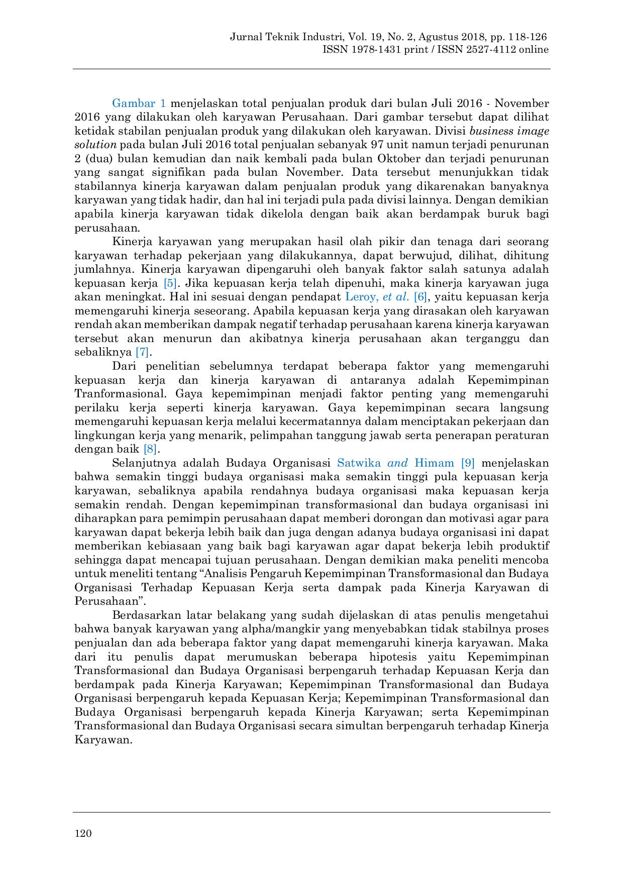 Jurnal Teknik IndustriJurnal Teknik IndustriPenelitian ini bertujuan untuk menganalisis kinerja karyawan. Kinerja karyawan merupakan hasil olah pikir dan tenaga dari seorang karyawan terhadap pekerjaan yang dilakukannya, dapat berwujud, dilihat, dihitung jumlahnya. Kinerja karyawan dipengaruhi oleh beberapa faktor yaitu Kepemimpinan Transformasional, Budaya Organisasi dan Kepuasan Kerja. Mengacu pada tujuan penelitian yang dilakukan yaitu untuk menganalisis beberapa variabel – variabel penelitian yang diteliti maka penelitian ini bersifat deskriptif dan verifikatif. Dalam analisa deskriptif dijelaskan tentang variabel – variabel independen maupun variabel – variabel dependen yang menjadi landasan teori. Dalam penelitian ini, analisa verifikatif yang digunakan adalah statistik Structural Equation Modelling (SEM) dengan bantuan program Lisrel.