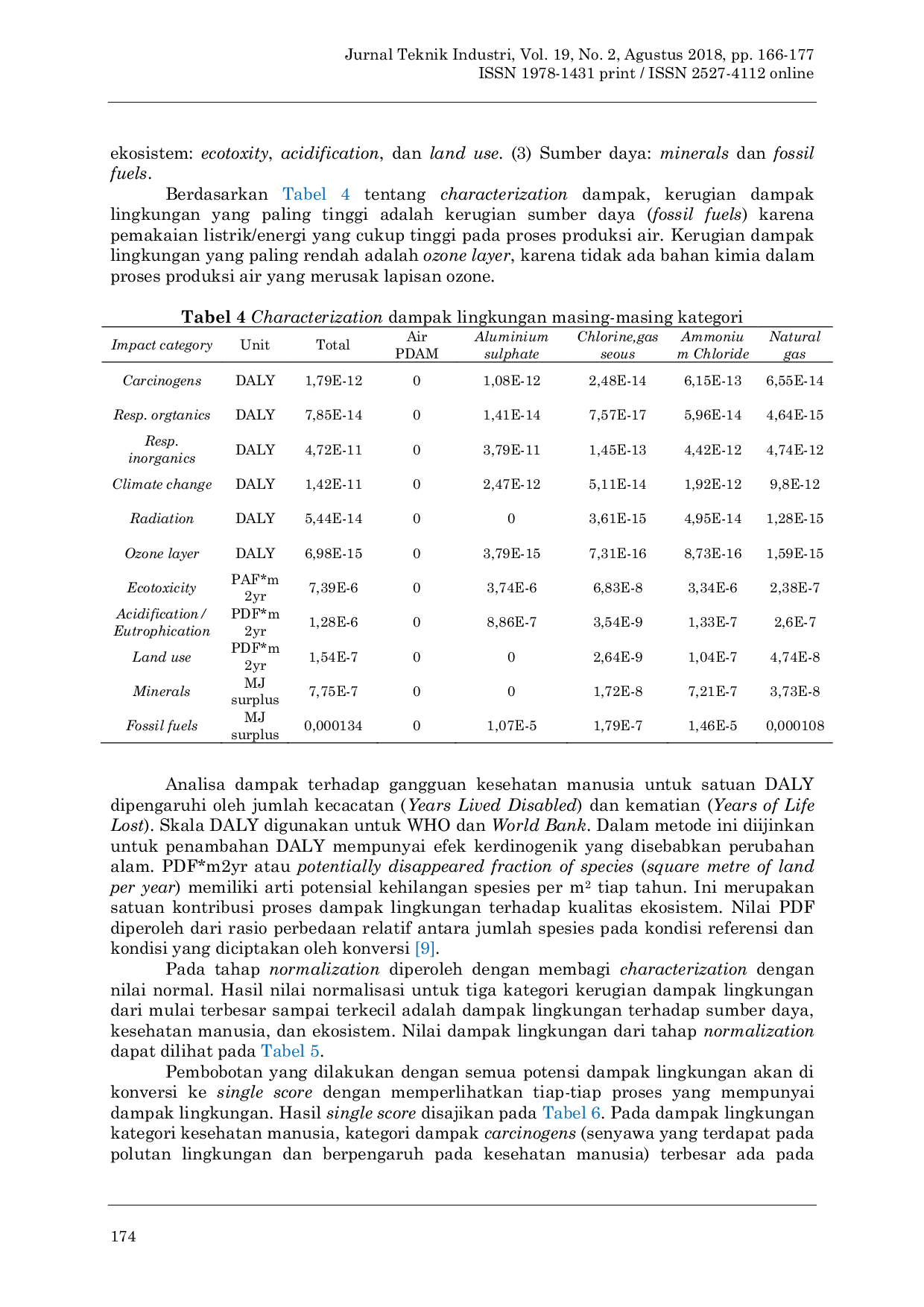 Jurnal Teknik IndustriJurnal Teknik IndustriInstalasi Pengolahan Air Minum Babat (IPAM Babat) merupakan salah satu fasilitas penyedia air bersih untuk memenuhi kebutuhan masyarakat Lamongan. Dalam pengolahan air bersih dibutuhkan pengolahan yang profesional dan tepat guna. Proses produksi air membutuhkan bahan kimia dan energi yang dapat berdampak pada lingkungan. Salah satu metode untuk menganalisis dampak proses produksi terhadap lingkungan adalah Life Cycle Assessment (LCA). Empat fase utama LCA adalah Goal And Scope Definition, Life Cycle Inventory, Life Cycle Impact Assessment, dan Interpretation. Dampak lingkungan hasil pengolahan metode LCA terbagi menjadi tiga kategori besar dampak, yaitu kategori kesehatan manusia, kualitas ekosistem, dan sumber daya. Dari pengolahan LCA, penggunaan energi listrik pada proses produksi air berkontribusi terbesar terhadap dampak lingkungan. Dampak tersebut memengaruhi kategori pengurangan sumber daya (bahan bakar fosil) dan kesehatan manusia (perubahan iklim) akibat pembakaran CO2. Penggunaan energi listrik terbesar disebabkan penggunaan lima pompa di intake dengan jarak tempuh cukup jauh dari intake ke IPAM. Solusi untuk mengurangi dampak lingkungan akibat penggunaan energi listrik adalah peningkatan efisiensi peralatan dan sistem aliran air memanfaatkan gaya gravitasi.