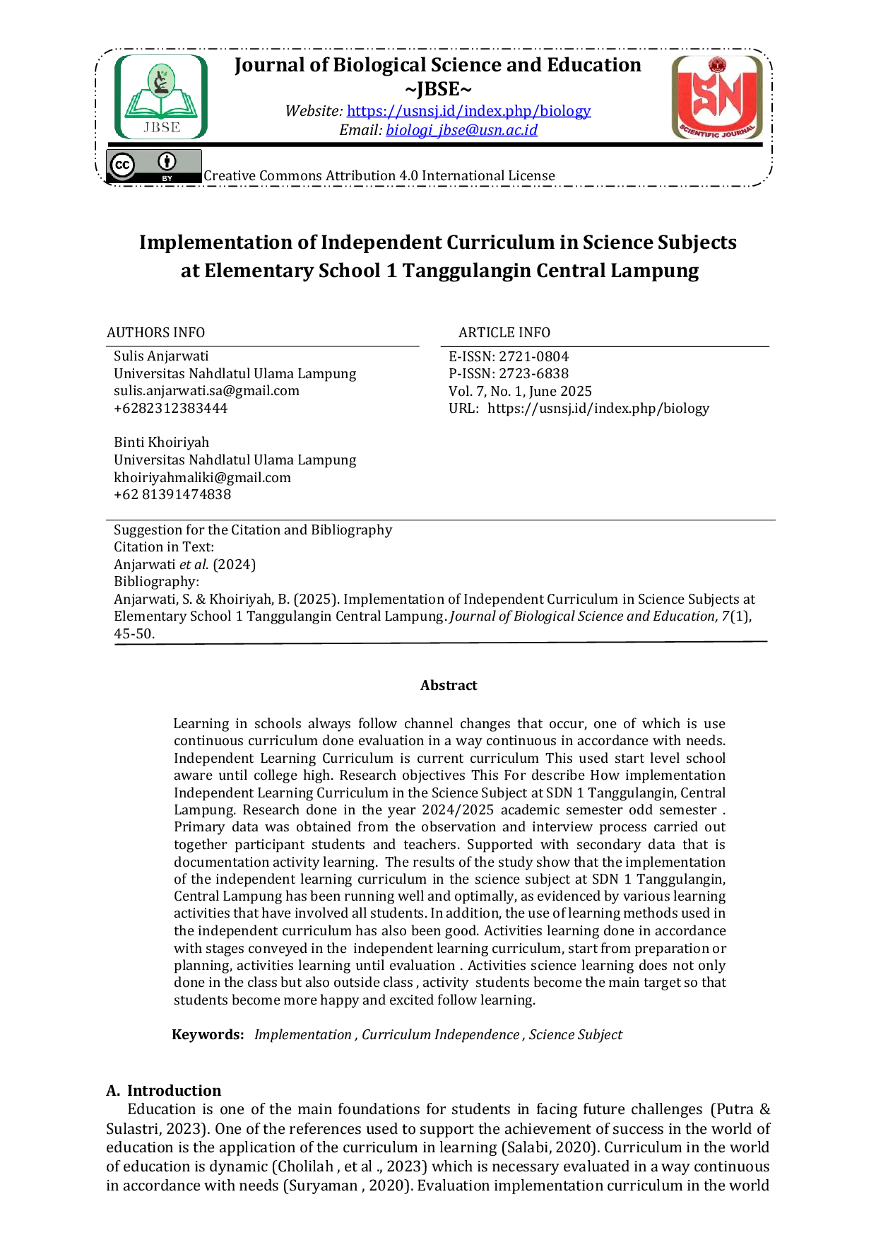 Journal of Biological Science and EducationJournal of Biological Science and EducationPembelajaran di sekolah selalu mengikuti perubahan saluran yang terjadi, salah satunya adalah penggunaan evaluasi berkelanjutan sesuai dengan kebutuhan. Kurikulum Belajar Mandiri merupakan kurikulum yang digunakan mulai tingkat sekolah dasar hingga pendidikan tinggi. Tujuan penelitian ini adalah untuk mendeskripsikan bagaimana implementasi Kurikulum Belajar Mandiri dalam mata pelajaran Ilmu Pengetahuan Alam di SDN 1 Tanggulangin, Lampung Tengah. Penelitian dilakukan pada tahun ajaran 2024/2025 semester ganjil. Data primer diperoleh dari proses observasi dan wawancara yang dilakukan bersama peserta didik dan guru. Didukung dengan data sekunder berupa dokumentasi kegiatan belajar. Hasil penelitian menunjukkan bahwa implementasi kurikulum belajar mandiri dalam mata pelajaran ilmu pengetahuan alam di SDN 1 Tanggulangin, Lampung Tengah telah berjalan dengan baik dan optimal, sebagaimana dibuktikan dengan berbagai kegiatan pembelajaran yang telah melibatkan seluruh peserta didik. Selain itu, penggunaan metode pembelajaran yang digunakan dalam kurikulum belajar mandiri juga telah baik. Kegiatan pembelajaran dilakukan tidak hanya di kelas tetapi juga di luar kelas, kegiatan peserta didik menjadi target utama sehingga peserta didik menjadi lebih senang dan bersemangat mengikuti pembelajaran.
