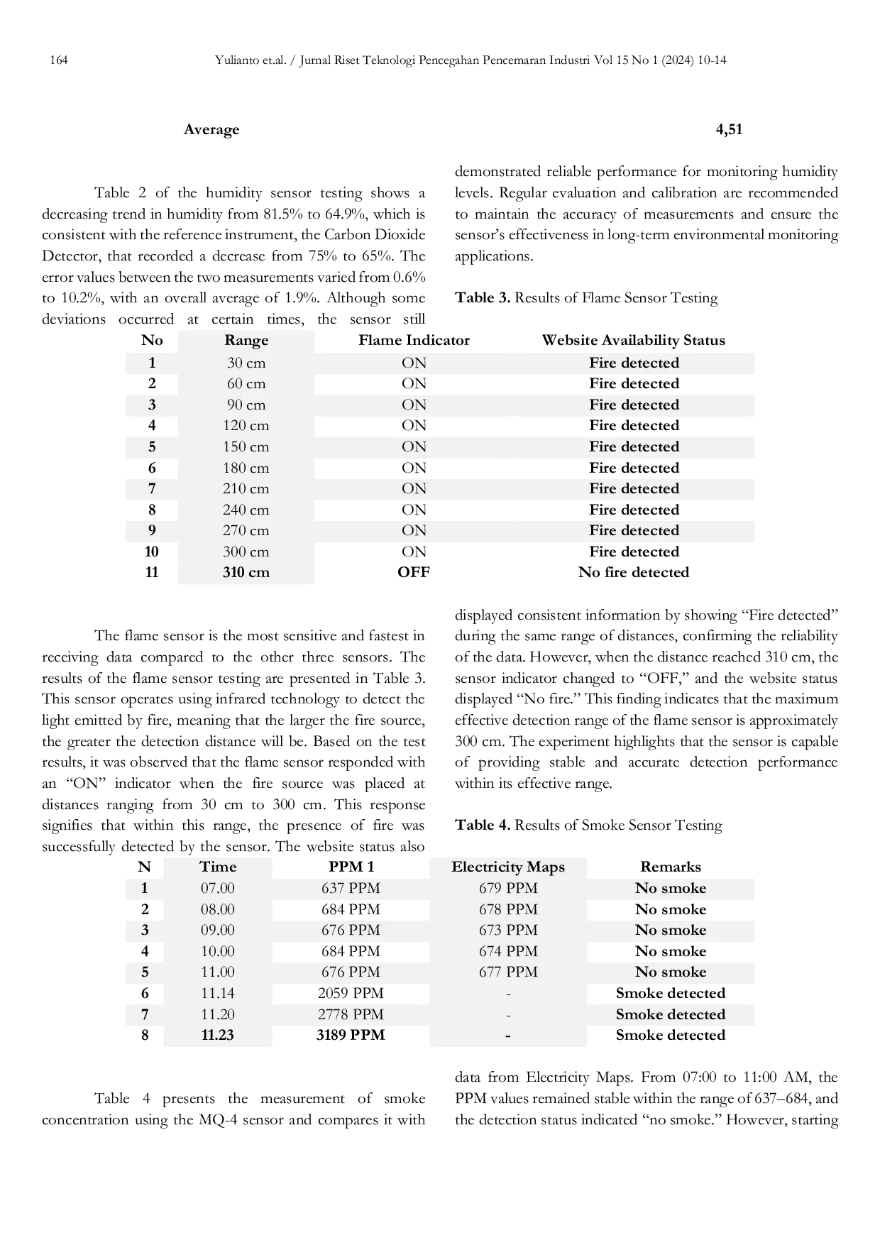 Jurnal Riset Teknologi Pencegahan Pencemaran IndustriJurnal Riset Teknologi Pencegahan Pencemaran IndustriKebakaran hutan dan lahan merupakan tantangan lingkungan yang berulang di Indonesia, terutama selama musim kering yang berkepanjangan. Insiden ini menyebabkan konsekuensi yang signifikan, termasuk kerusakan ekosistem, ancaman terhadap kesehatan manusia, dan gangguan ekonomi yang besar. Untuk mengatasi masalah ini, penelitian ini berfokus pada pengembangan sistem berbasis Internet of Things (IoT) yang dirancang untuk memprediksi dan memantau risiko kebakaran hutan dengan menerapkan metode Fuzzy Logic. Prototipe ini mengintegrasikan beberapa sensor, yaitu sensor DHT22 untuk mengukur suhu dan kelembaban, sensor MQ-2 untuk mendeteksi konsentrasi gas dan asap, serta sensor api untuk mengidentifikasi keberadaan api. Semua sensor terhubung ke mikrokontroler NodeMCU ESP8266 yang berfungsi sebagai inti pemrosesan data dan komunikasi nirkabel. Data sensor yang dikumpulkan dievaluasi menggunakan algoritma Fuzzy Logic, yang mengklasifikasikan risiko kebakaran menjadi tiga tingkat yang berbeda: Aman, Hati-hati, dan Berbahaya. Pengujian eksperimental menunjukkan bahwa sistem merespons secara efektif terhadap fluktuasi suhu, kelembaban, tingkat asap, dan api yang terlihat secara real-time, dengan peringatan ditampilkan melalui dashboard berbasis web. Sensor DHT22 menunjukkan tingkat kesalahan rata-rata antara 4,8% dan 5% untuk pembacaan suhu dan antara 4,1% dan 4,5% untuk pengukuran kelembaban. Selain itu, sensor api berhasil mendeteksi sumber api pada jarak hingga 300 cm. Hasilnya mengonfirmasi bahwa sistem mencapai tingkat keandalan dan akurasi yang tinggi, sehingga memberikan dukungan yang berharga untuk peringatan dini, memperkuat strategi pencegahan, dan membantu otoritas dalam meringankan dampak serius dari kebakaran hutan dan lahan.