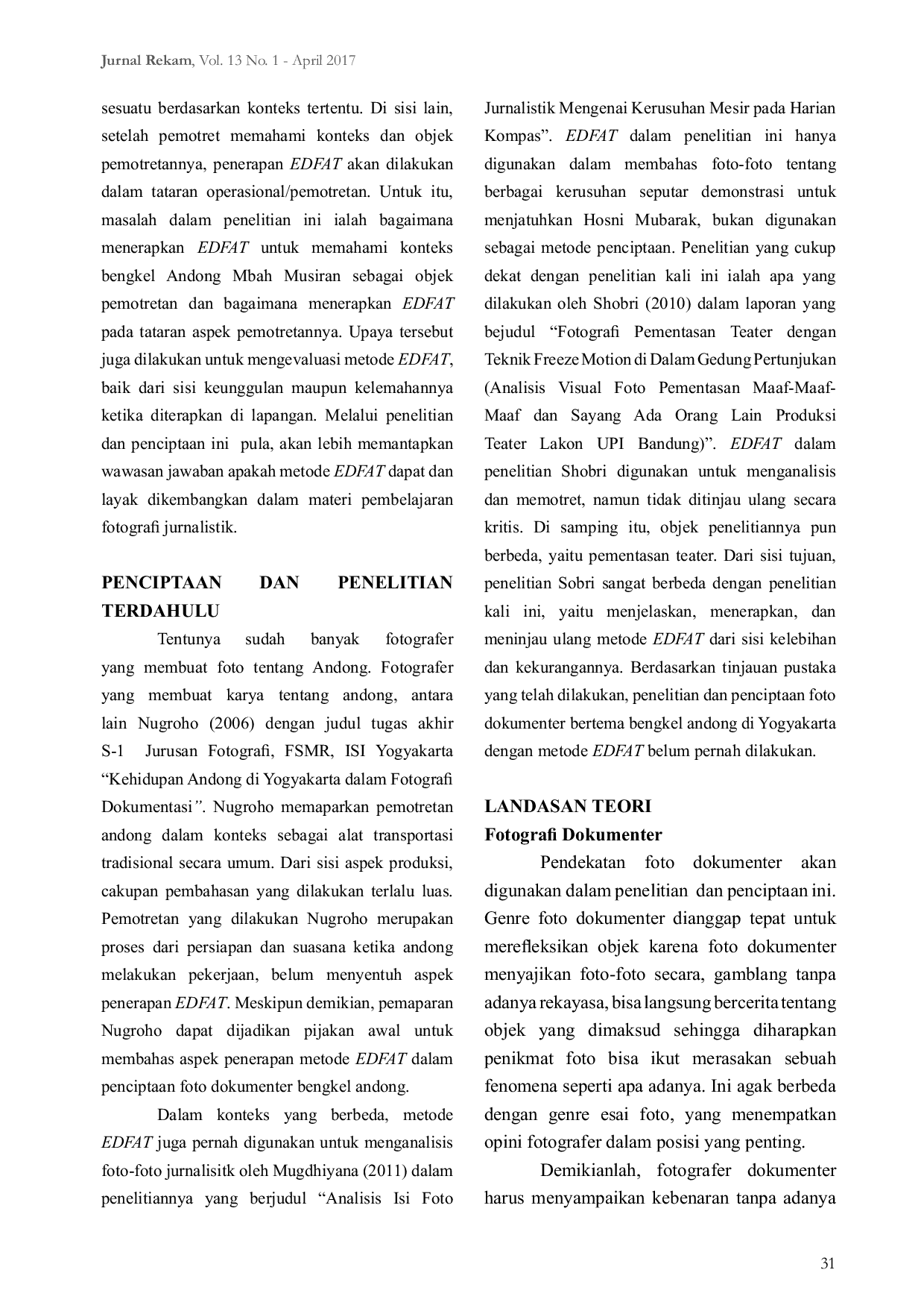 RekamRekamMetode Entire, Detail, Frame, Angle, Time (EDFAT) belum begitu dikenal dalam dunia fotografi. Akan tetapi, metode tersebut sebenarnya sudah lazim di kalangan praktisi, khususnya fotografer jurnalistik. Untuk itu, penelitian dan penerapan EDFAT menjadi penting dilakukan, mengingat dalam kenyataannya metode tersebut sangat efektif dan efisien. Penelitian ini merupakan upaya untuk memahami dan menerapkan metode EDFAT. Subjek penelitian ialah Bengkel Andong Mbah Musiran yang berada di kawasan Jotawang, Yogyakarta. Hasil penelitian menunjukkan bahwa metode EDFAT memang dapat diterapkan dalam penciptaan karya fotografi, terlebih jika sebelum pemotretan, fotografer terlebih dahulu menghimpun informasi yang berkaitan dengan subjek pemotretan.