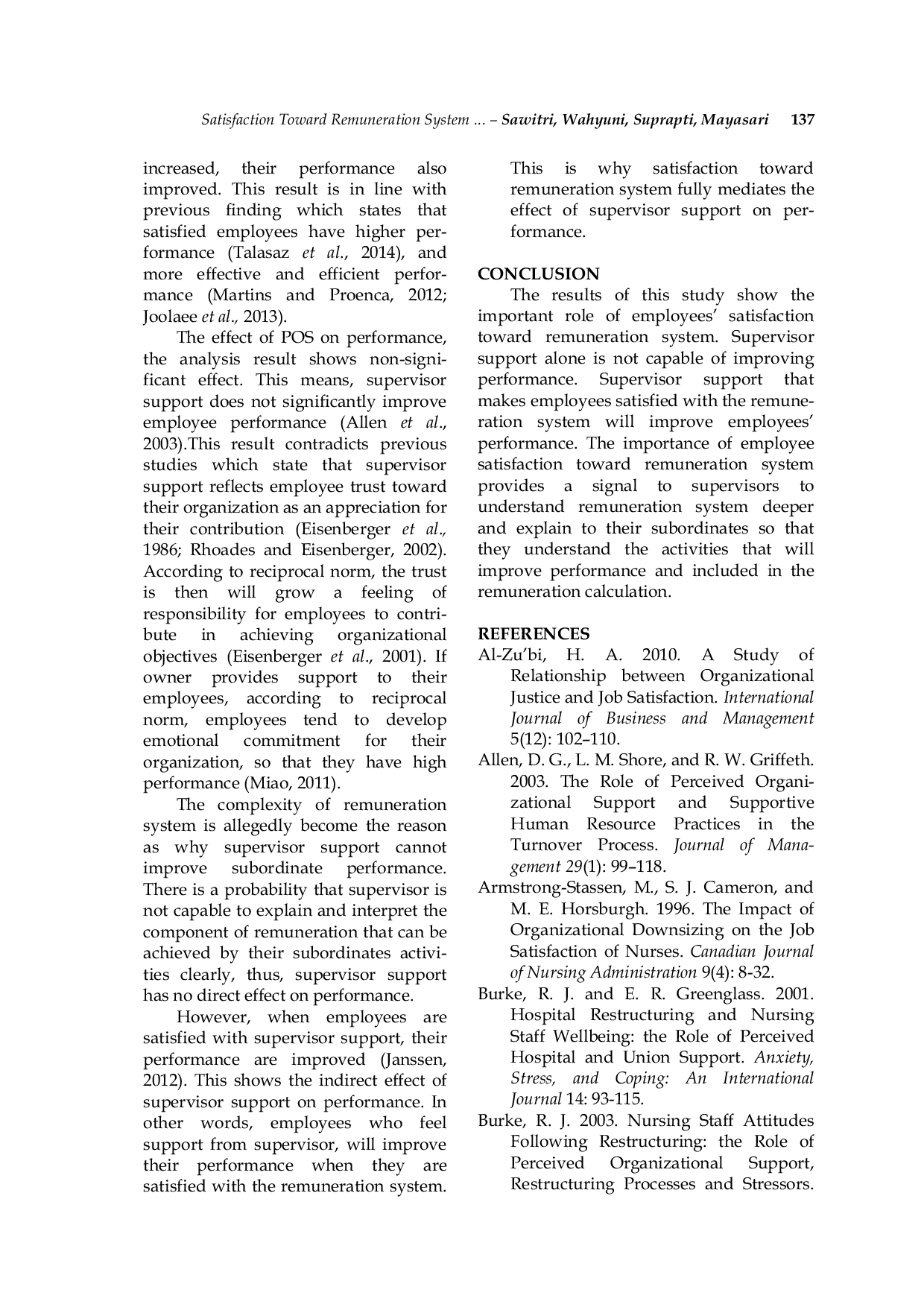 Hasil penelitian ini menunjukkan peran penting kepuasan karyawan terhadap sistem remunerasi.Dukungan supervisor saja tidak cukup untuk meningkatkan kinerja, namun ketika supervisor membuat karyawan puas dengan sistem remunerasi, kinerja karyawan meningkat.Kepuasan terhadap sistem remunerasi memungkinkan pemahaman yang lebih mendalam tentang mekanisme remunerasi dan dapat dijelaskan kepada bawahan sehingga aktivitas yang meningkatkan kinerja dapat dimasukkan dalam perhitungan remunerasi.
